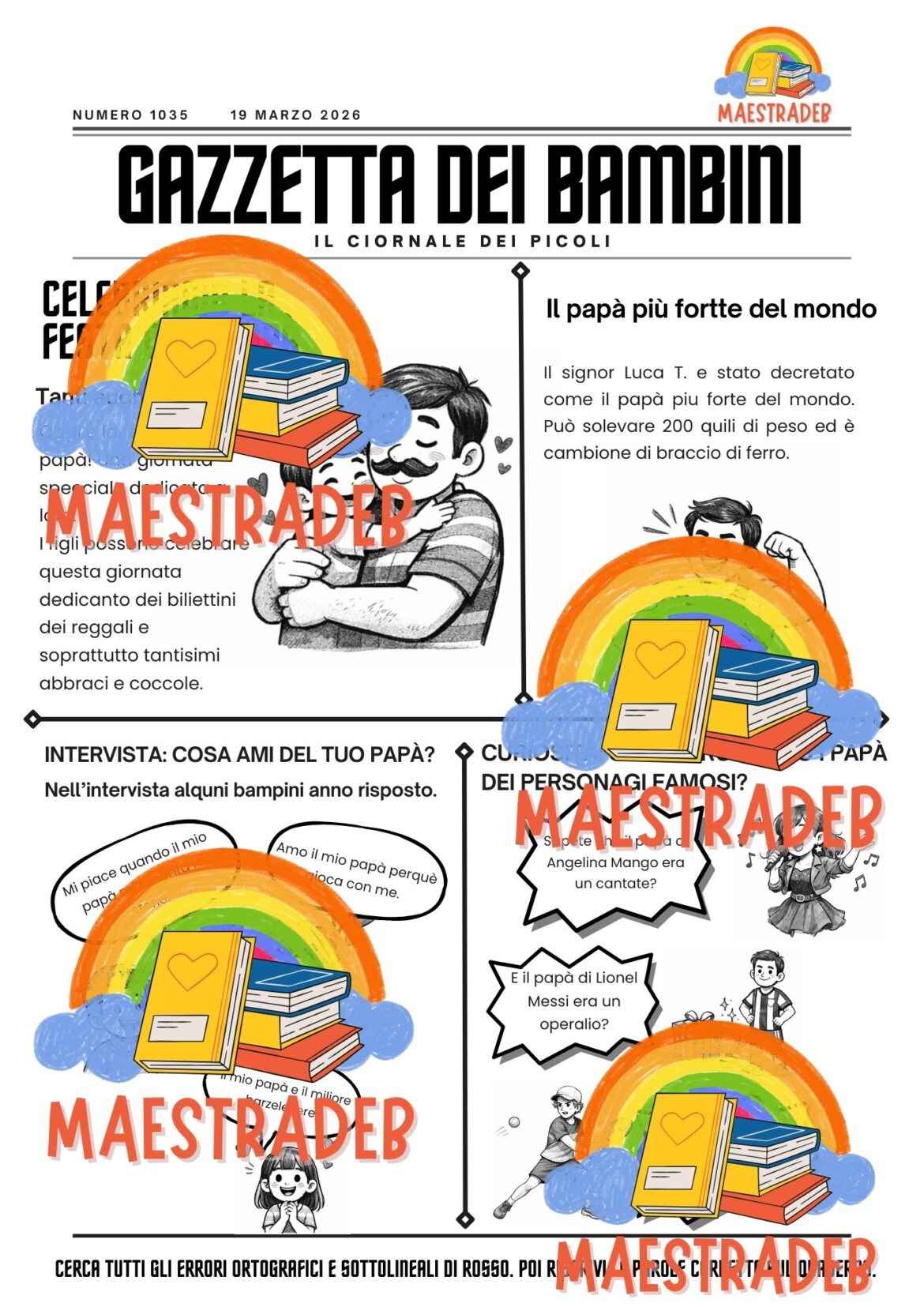 Un’attività divertente e coinvolgente per celebrare la Festa del Papà (19 marzo) lavorando sull’ortografia! I bambini ricevono una finta pagina di giornale con varie notizie dedicate ai papà: interviste ai bambini, curiosità e immagini.
