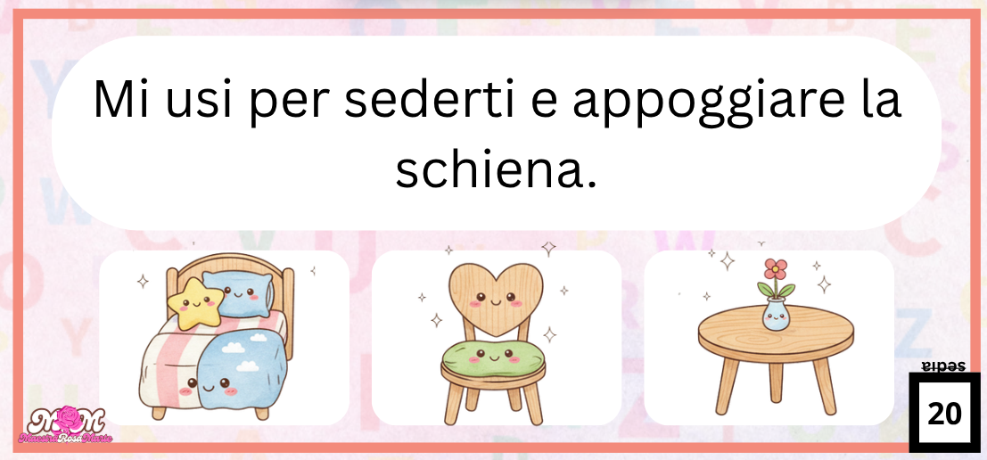 Supporto all’Ascolto (Fase Iniziale): 👂 Leggi tu le descrizioni ad alta voce, enfatizzando le parole chiave. I bambini seguono con il dito, concentrandosi sull’ascolto attivo e l’identificazione suono-immagine.
