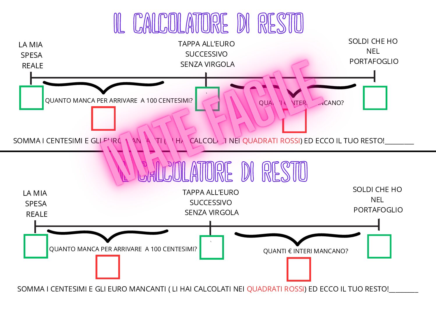 Scheda per facilitare il calcolo del resto in euro, suddividento la procedura in due passaggi