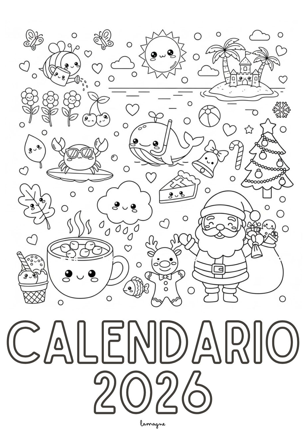 Ogni mese presenta illustrazioni in bianco e nero pronte per essere colorate, favorendo un momento di relax e creatività individuale. Le griglie dei giorni sono ampie e pulite, lasciando tutto lo spazio necessario per annotare: