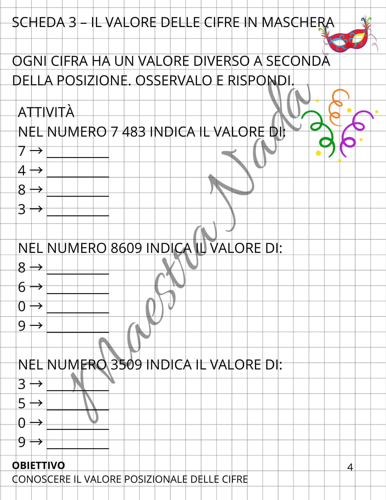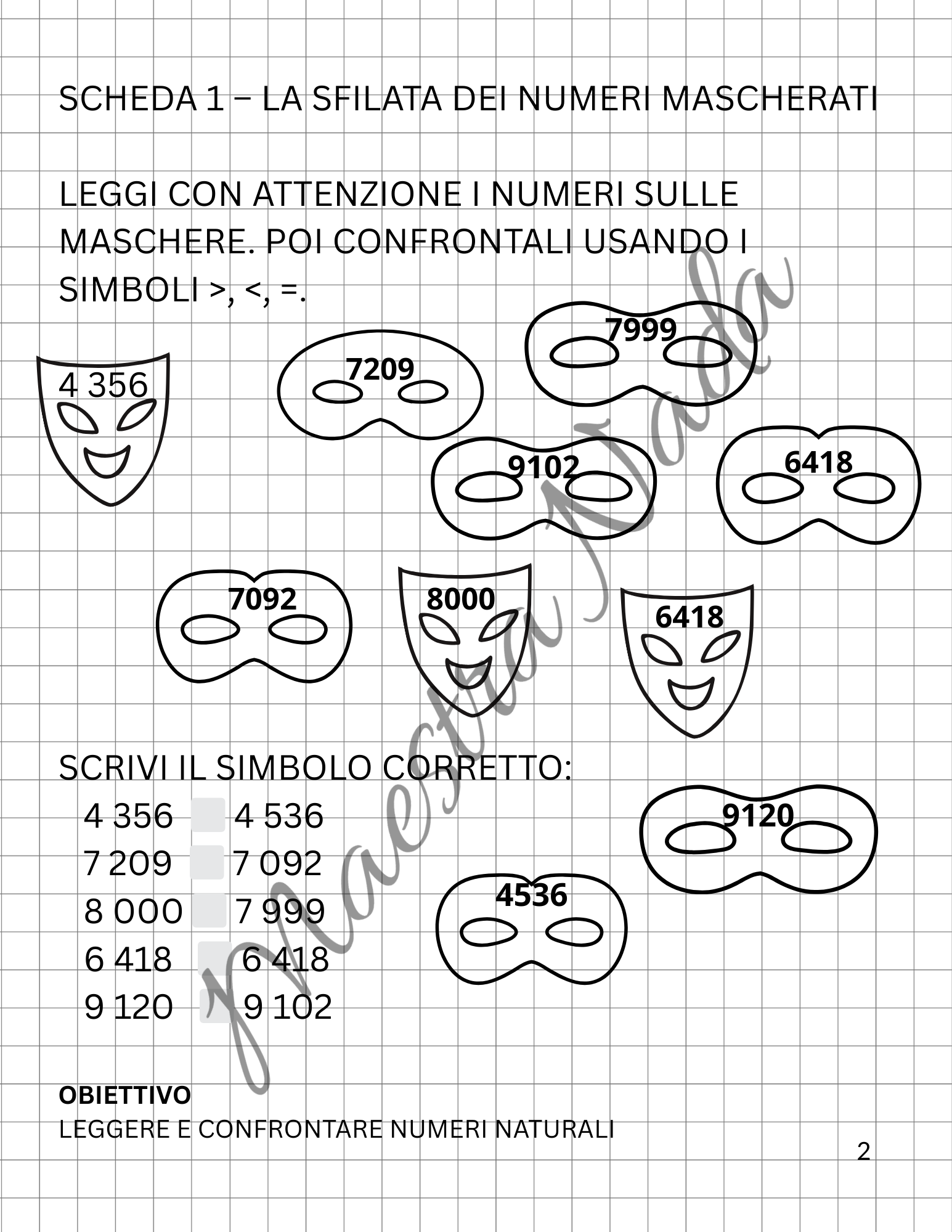 Per questo nasce “Carnevale matematico”, un plico completo di schede di matematica per la classe quarta primaria, progettato per consolidare le competenze in modo graduale, coinvolgente e inclusivo.