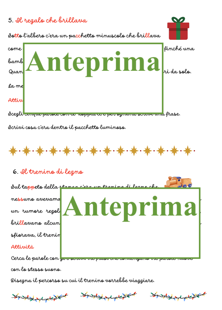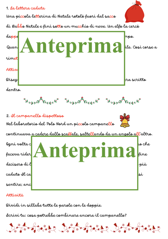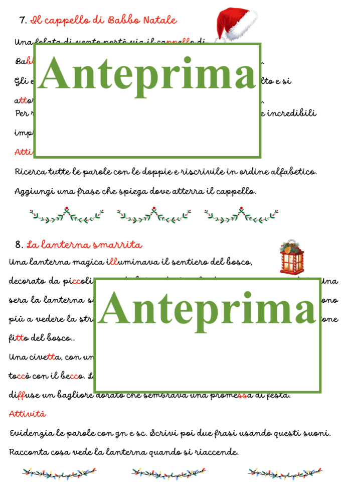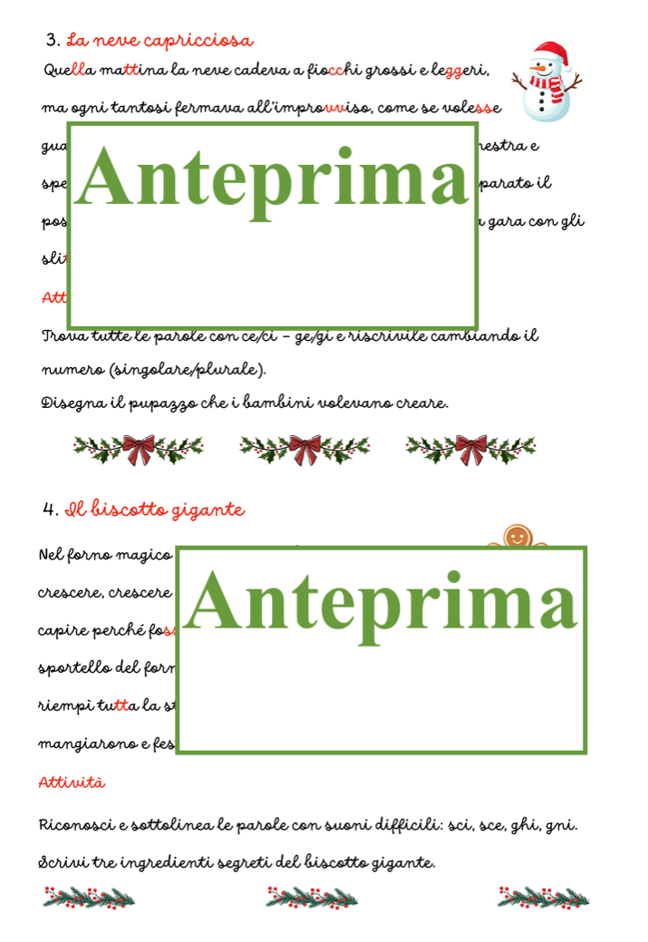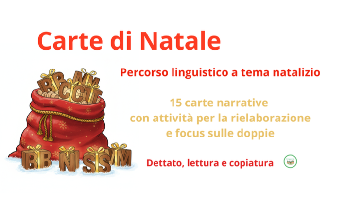 Carte Natalizie di Lettura, Dettato e Copiatura 15 testi narrativi a tema Natale per lavorare sulle doppie e sui suoni complessi Un materiale pensato per trasformare l’ortografia in un’esperienza viva, immersiva e significativa. Le 15 carte contengono piccoli racconti natalizi originali, accompagnati da illustrazioni evocative e da parole con doppie evidenziate in rosso (e altri suoni complessi), per favorire attenzione visiva, ascolto analitico e rinforzo ortografico. Cosa contiene il materiale -15 carte- racconto a tema natalizio (elfi, slitte, biscotti, stelle, lanterne, abeti…) Parole ortograficamente mirate ( gruppi consonantici, suoni complessi) con l’evidenziazione in rosso delle lettere doppie. -2 attività per ogni carta -rinforzo ortografico – breve proposta di rielaborazione creativa (frase, finale, disegno, dettaglio narrativo) -Illustrazione a tema su ogni carta Uso flessibile: dettato, copiatura, lettura autonoma, lavoro individuale e di piccolo gruppo Come utilizzarle Dettato significativo: l’insegnante legge il racconto completo e lo detta integralmente o in parte. La carta permette le verifica autonoma dell’errore. Copiatura con rielaborazione: l’alunno copia il testo o parte di esso e prosegue con l’attività creativa. Lettura individuale: i bambini possono scegliere una carta, leggerla, individuare le parole chiave e completare la rielaborazione. Angolo di scrittura: perfette per lavori autonomi Percorsi natalizi: ideale per un percorso linguistico tematico Obiettivi Consolidare le difficoltà ortografiche (doppie, suoni complessi, gruppi consonantici) Potenziare la lettura scorrevole Rafforzare l’ascolto e l’attenzione durante il dettato Favorire la produzione scritta guidata Offrire un contesto narrativo ricco, caldo e motivante