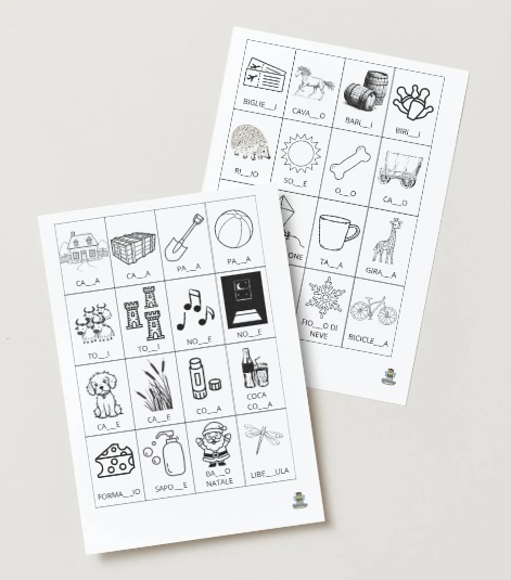 In questo materiale troverai 48 carte, tutte con l’immagine e sotto il nome di quanto rappresentato ma senza una lettera (che potrebbe essere doppia oppure no). Alcune parole cambiano in base al significato, altre sono più complesse, lettere ponte… Il materiale è vario, potrete fare una selezione delle carte da usare.