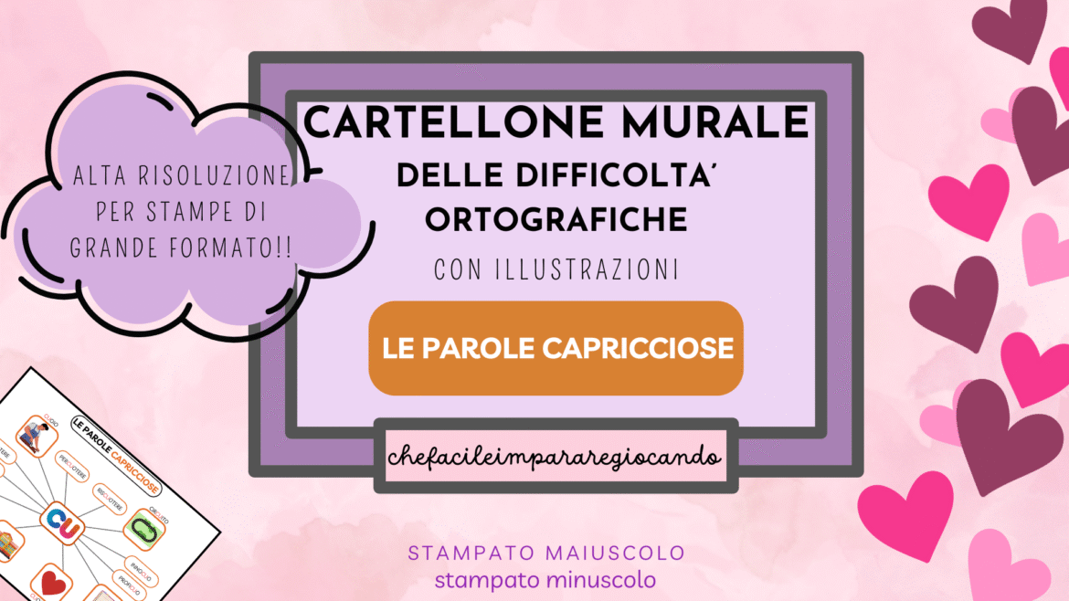 📘 Cartello – Le parole capricciose ✏️(cuoco, cuore, taccuino…) – Stampato maiuscolo e minuscolo