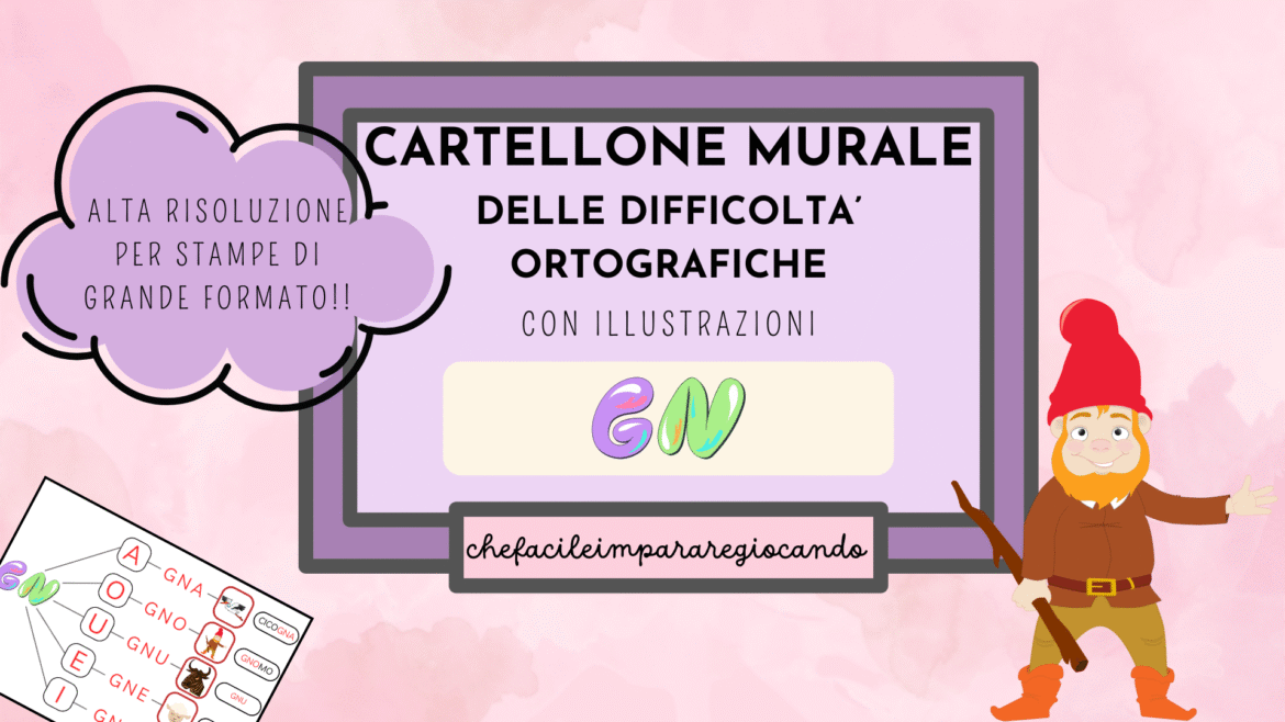 Progettato per offrire un supporto visivo chiaro e immediato, aiuta i bambini a riconoscere e utilizzare correttamente il suono “GN” nelle parole, favorendo una comprensione più profonda della struttura linguistica.