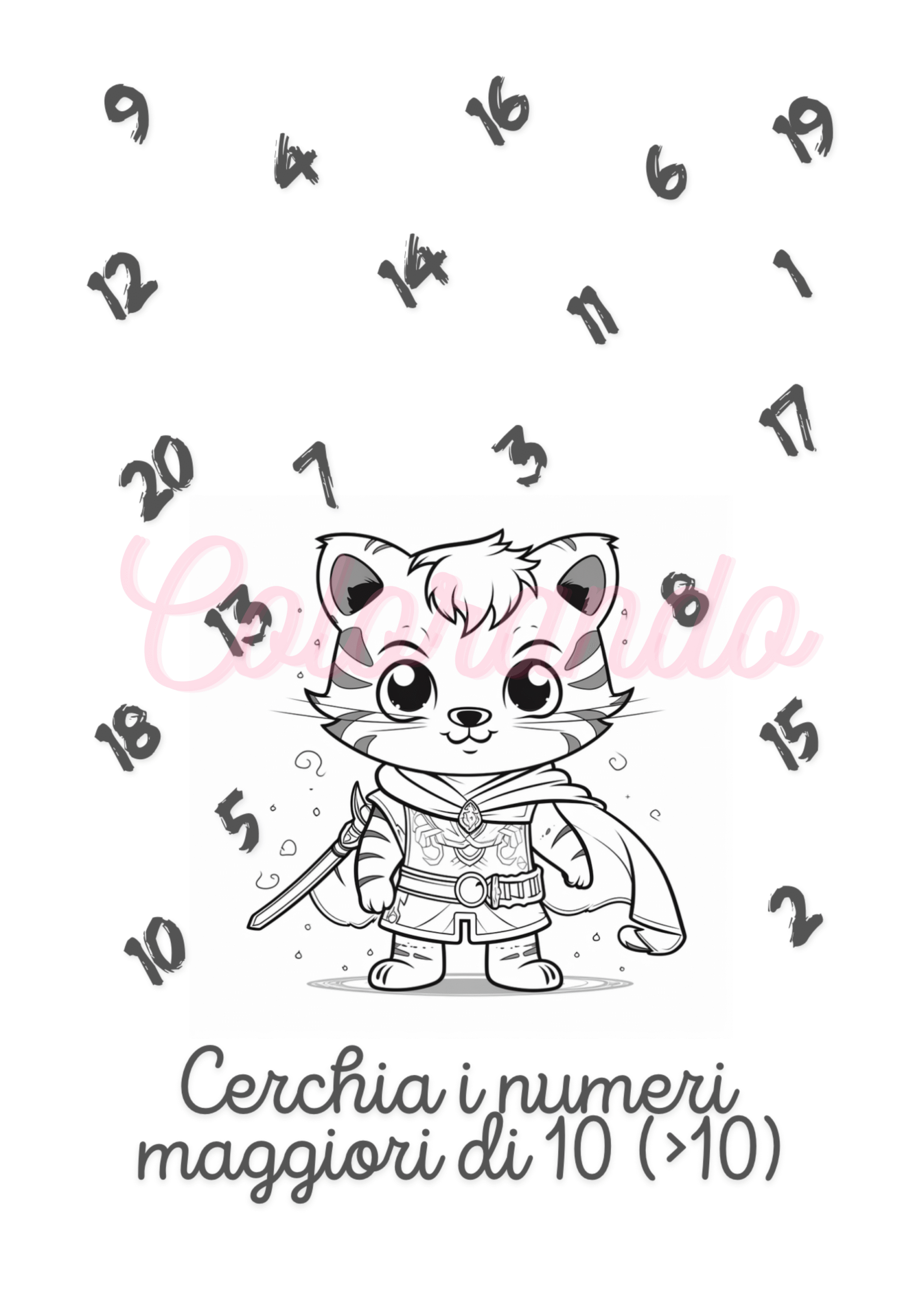 Disegni da Colorare: Ogni sfida è accompagnata da un simpatico personaggio (come il gattino guerriero) pronto per essere colorato una volta terminato l’esercizio.