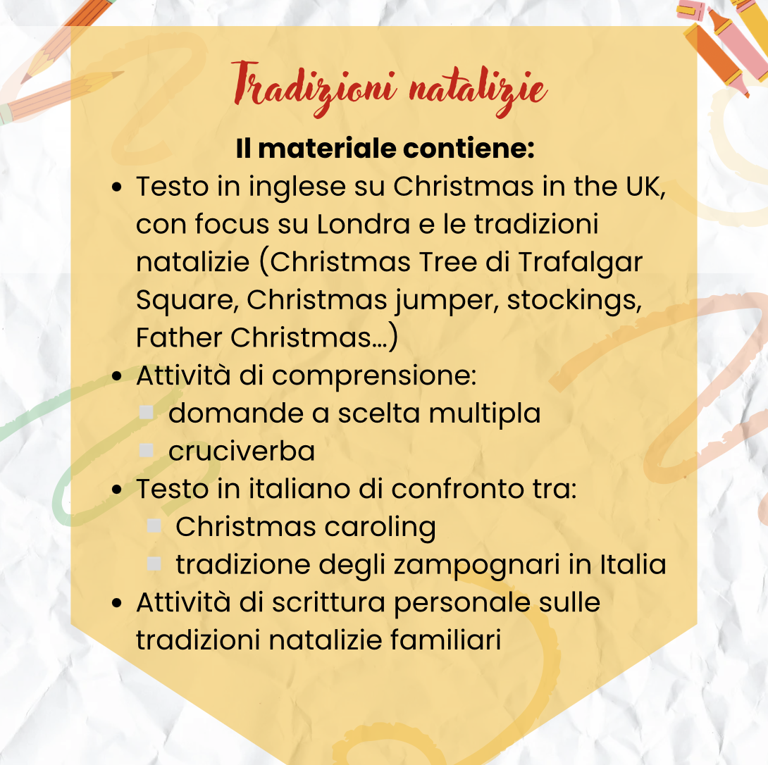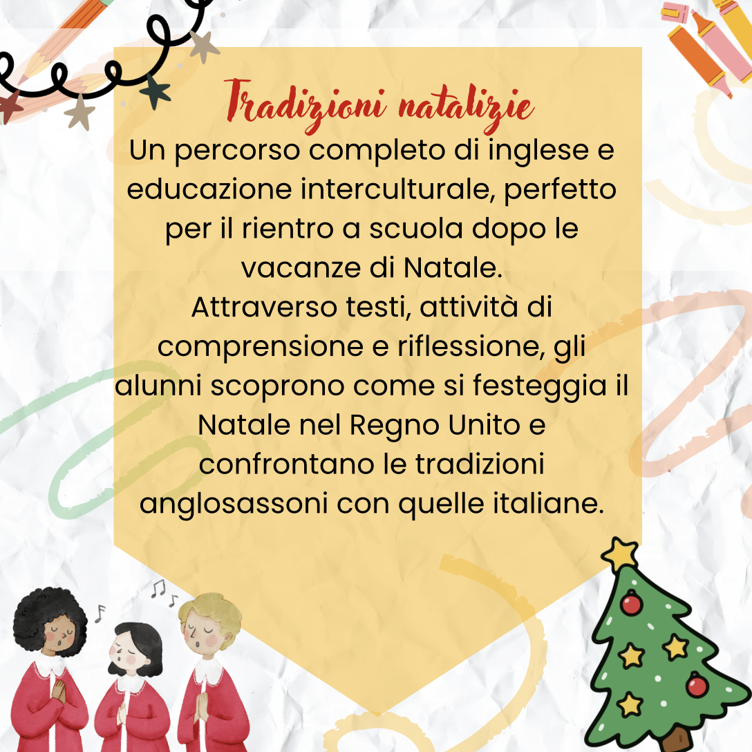 Attraverso testi, attività di comprensione e riflessione, gli alunni scoprono come si festeggia il Natale nel Regno Unito e confrontano le tradizioni anglosassoni con quelle italiane.