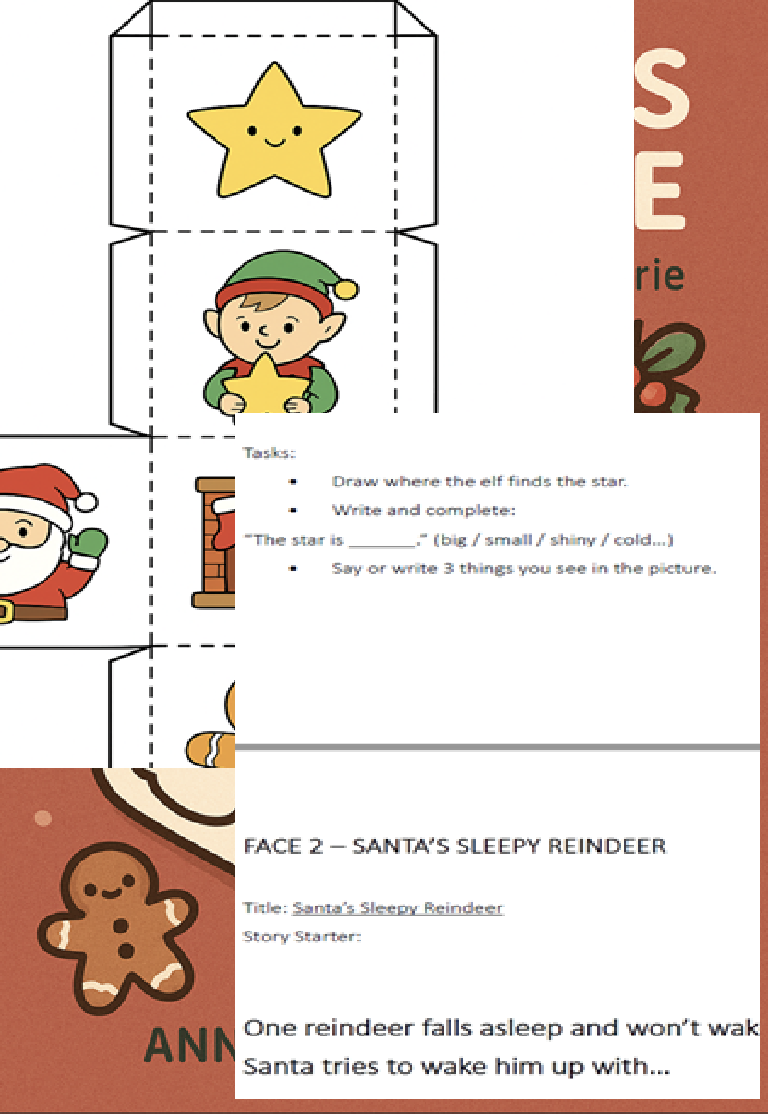 ·      Avrete sei facce con sei possibili storie: seguite i suggerimenti e le attività ricopiandole sul quaderno, magari ritagliate (o copiate), ogni singola storia e i bambini la illustreranno, ma giocate come preferite voi: in teoria potrebbero essere utilizzate per sei lezioni se volete ampliare con storytelling ad esse associate, come Rudolph, The gingerbread man, ecc…)