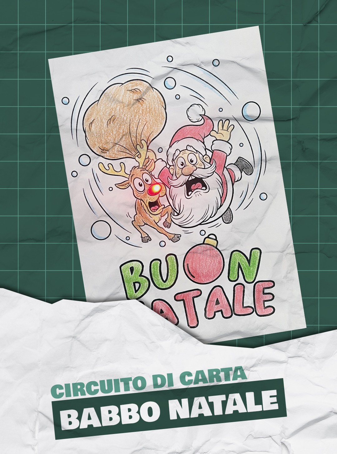 Babbo Natale e Rudolph ruzzolano sulla neve… e con un semplice click sulla pallina di Natale, il naso di Rudolph si illumina davvero! Un circuito di carta magico per raccontare, creare e sperimentare l’elettronica in modo divertente e natalizio.