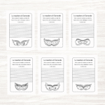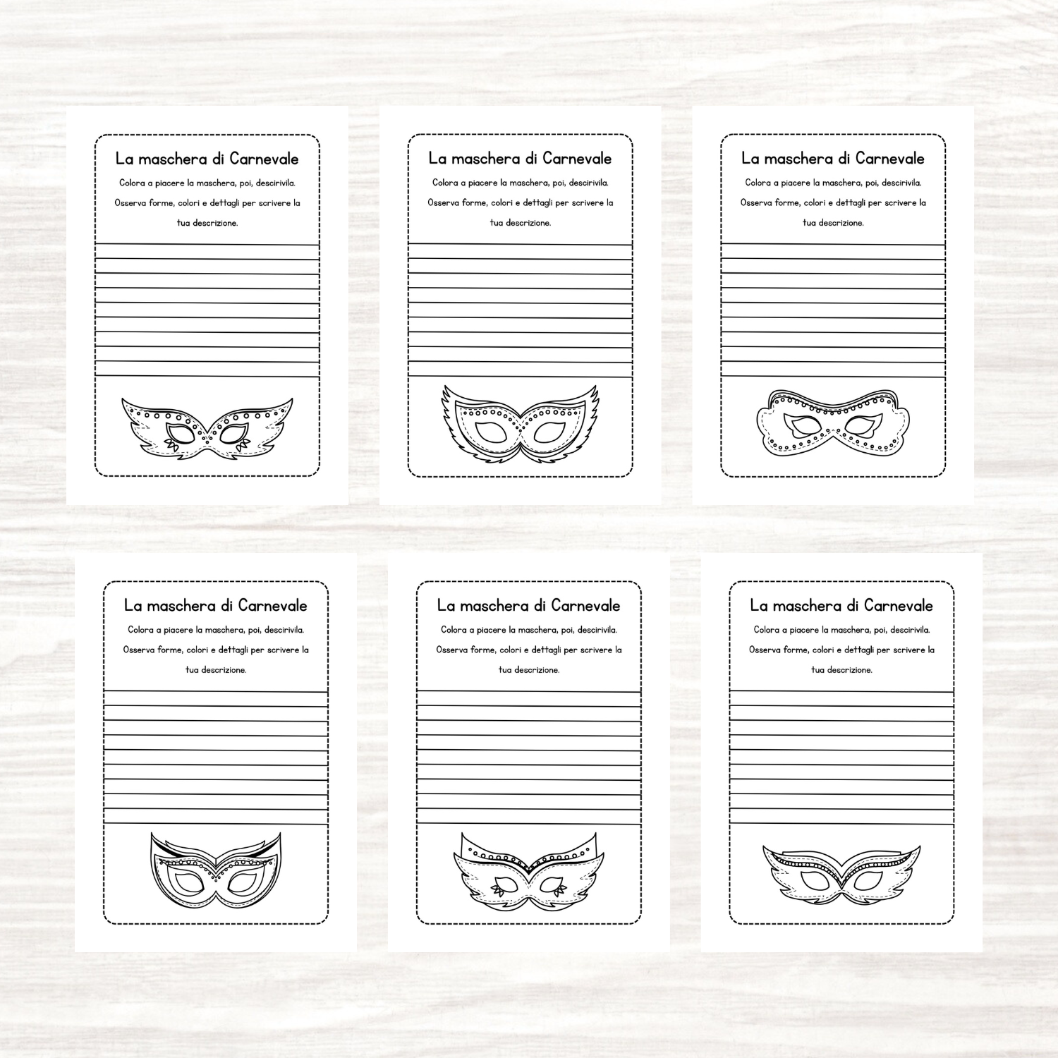 Questo PDF “colora e descrivi la maschera di Carnevale” include 6 pagine da stampare e colorare, con maschere da colorare e descrivere.