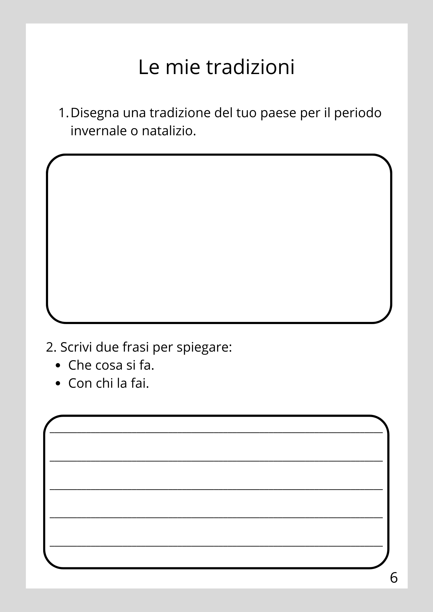 • Azioni e tradizioni: Completano frasi con verbi d’azione e hanno l’opportunità di disegnare e raccontare le proprie tradizioni invernali o natalizie.