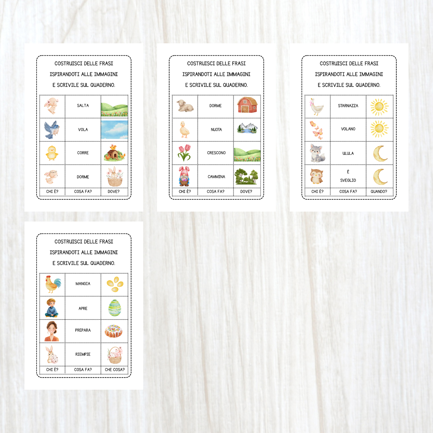Questo PDF racchiude 4 pagine ritagliabili, utili per aiutare i bambini a comporre autonomamente delle prime frasi.
