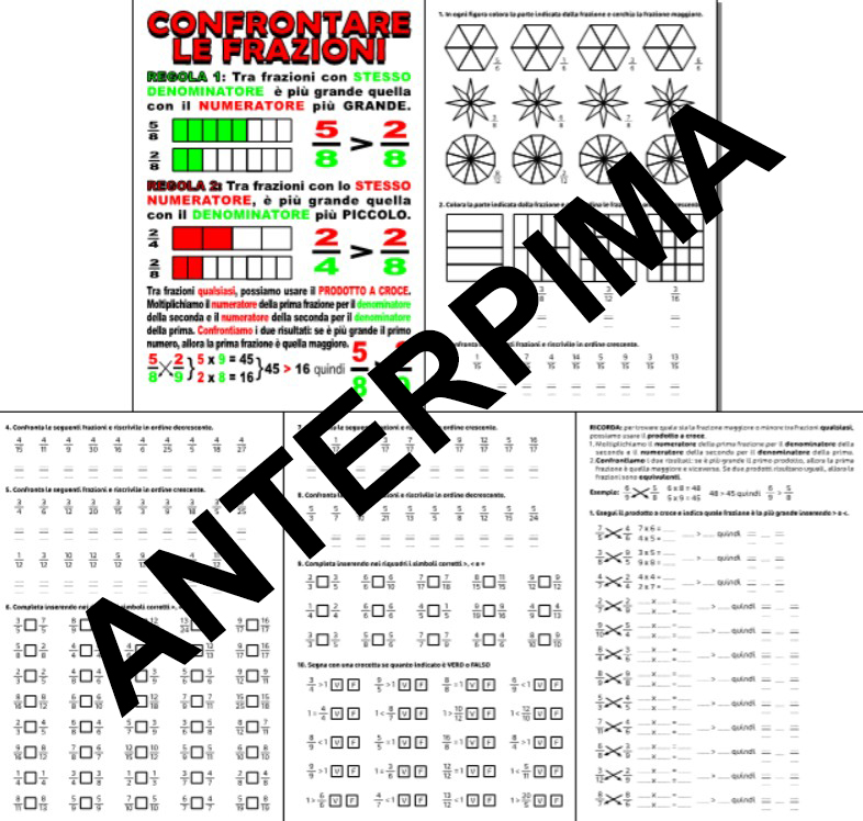Cinque schede PDF in formato A4 sul confronto di frazioni dalla classe quarta della scuola primaria.