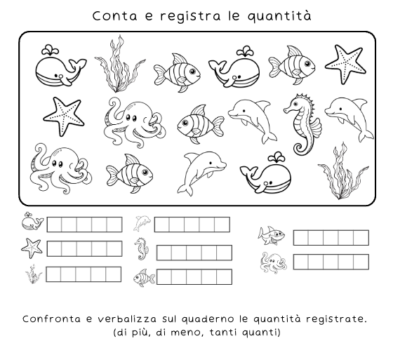 5 attività che permettono ai bambini di confrontare le quantità, riflettendo sui concetti di tanto, poco, nessuno e tanto quanto. Attraverso l’insiemistica, sperimentano in modo attivo il significato delle diverse quantità.