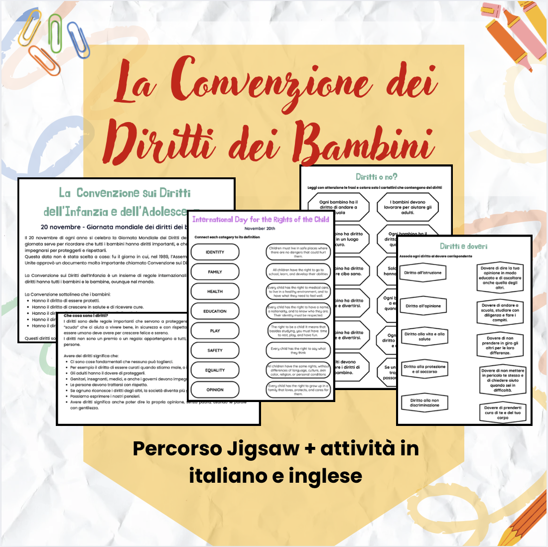 Ideale per la Giornata mondiale dei diritti dei bambini (20 novembre), per educazione civica, CLIL o per un percorso annuale sui diritti e doveri