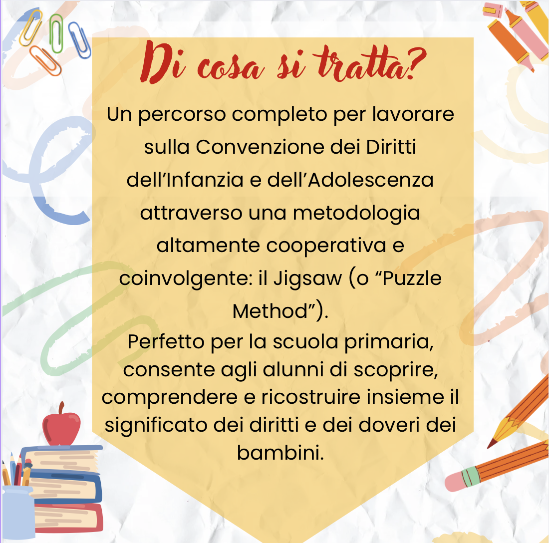 Un percorso completo per lavorare sulla Convenzione dei Diritti dell’Infanzia e dell’Adolescenza attraverso una metodologia altamente cooperativa e coinvolgente: il Jigsaw (o “Puzzle Method”).