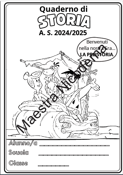 La copertina presenta un design pulito, con spazi dedicati per nome dell’alunno, scuola, classe e anno scolastico, e una grafica vivace con personaggi a tema amati dai bambini che li accompagneranno nel loro primo approccio allo studio della storia.