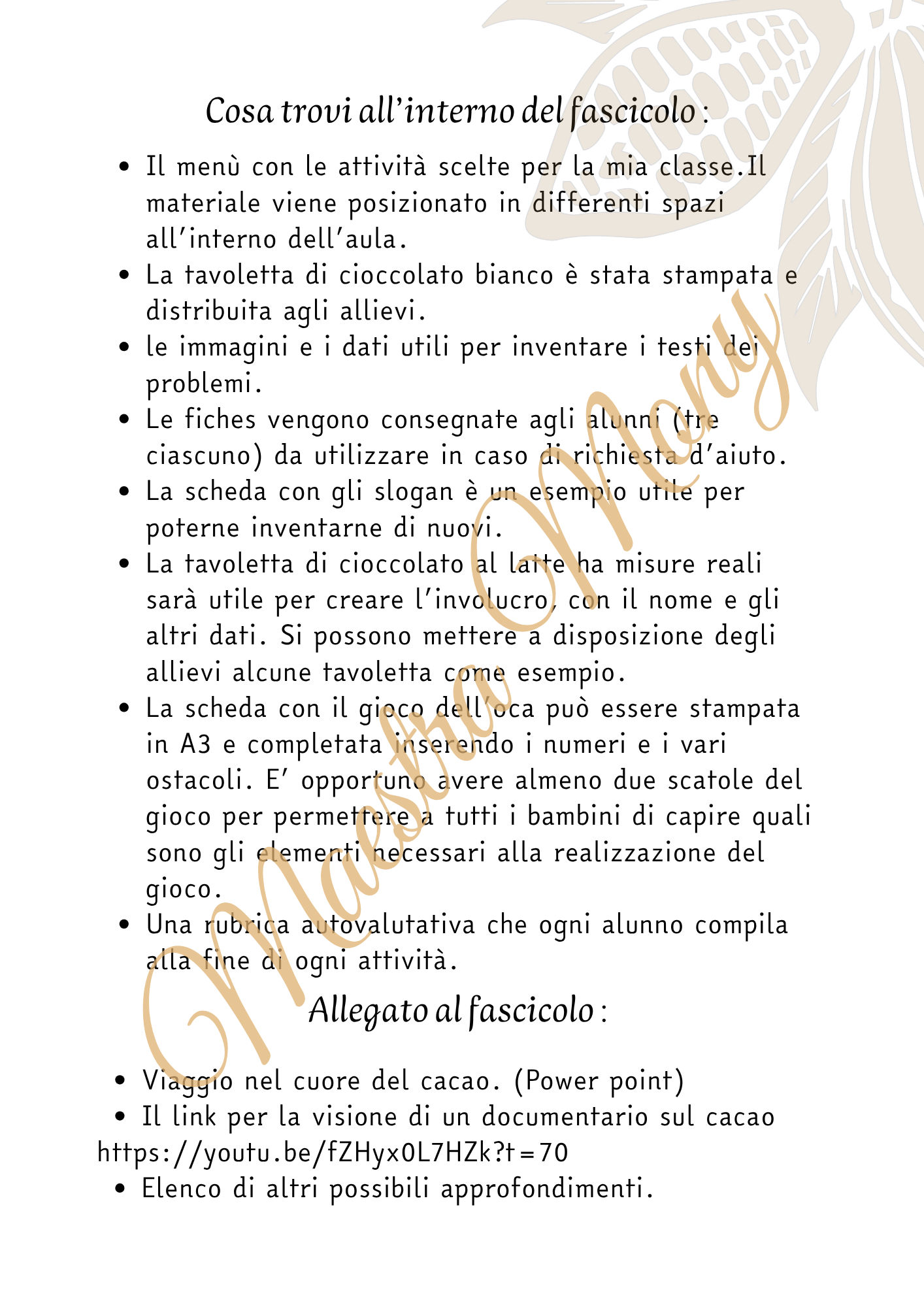 DAL CACAO AL CIOCCOLATO — LEARNING MENÙ Percorso interdisciplinare pronto all’uso per la scuola primaria “Dal cacao al cioccolato” è un fascicolo completo di attività, materiali operativi e strumenti valutativi, progettato secondo l’approccio Learning Menù: lo studente sceglie le attività da svolgere, esplora, crea, sperimenta e documenta, mentre il docente ha una struttura chiara e flessibile per lavorare in modalità laboratoriale. Il percorso si articola in 9 attività, collegate a competenze linguistiche, scientifiche, matematiche, artistiche e sociali, con materiali già pronti da stampare. Obiettivi formativi Il percorso sviluppa: Competenze disciplinari Geografia: individuare sul planisfero i paesi produttori di cacao. Italiano: produzione testi (slogan, descrizioni, ricette, problemi). Scienze: osservazione scientifica, conoscenza della pianta del cacao e del processo di produzione del cioccolato. Matematica: lettura dati, creazione e risoluzione di problemi, misurazioni. Arte: progettazione grafica di incarti e materiali visivi. Competenze trasversali autonomia e organizzazione del lavoro; problem solving; creatività; cooperazione; consapevolezza dei propri processi di apprendimento (grazie alla rubrica autovalutativa). Cosa contiene il fascicolo Il materiale include tutto ciò che serve per realizzare il percorso in classe: Materiali operativi Menù delle attività da consegnare agli alunni. Tavoletta di cioccolato bianco da stampare e distribuire. Immagini e dati per inventare problemi matematici. Fiches-bonus da consegnare agli alunni in caso di richiesta d’aiuto. Scheda con esempi di slogan pubblicitari. Tavoletta di cioccolato al latte in dimensioni reali per creare l’involucro. Tavola del gioco dell’oca del cacao pronta da completare. Schede sulle parti della pianta del cacao da ritagliare e abbinare. Ricetta guidata con ingredienti e procedimento da compilare. Rubrica autovalutativa per ogni attività svolta. Materiali allegati PowerPoint: Viaggio nel cuore del cacao. Dal cacao al cioccolato.(Video suggerito) Suggerimenti di approfondimento. Proponi questo fantastico percorso e sperimenta la metodologia del Learning Menù. Maestra Mony