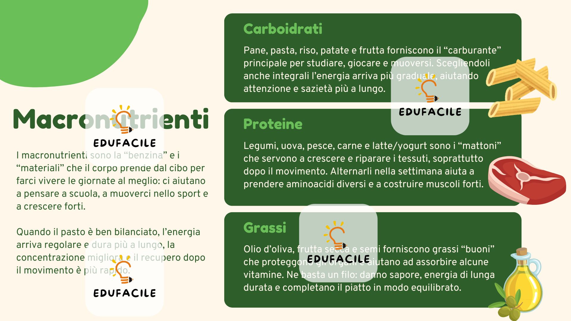 Contenuti e linguaggio sono calibrati per 9–11 anni. Il modulo non prescrive “diete”: promuove abitudini e scelte consapevoli in coerenza con il contesto scolastico e familiare.