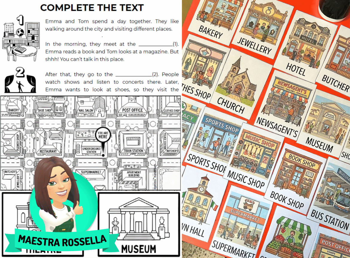 4) Il percorso prosegue con il lavoro sulle directions e sulle preposizioni di luogo, attraverso attività di osservazione, completamento, listening e scambio di indicazioni tra compagni utilizzando semplici mappe della città.