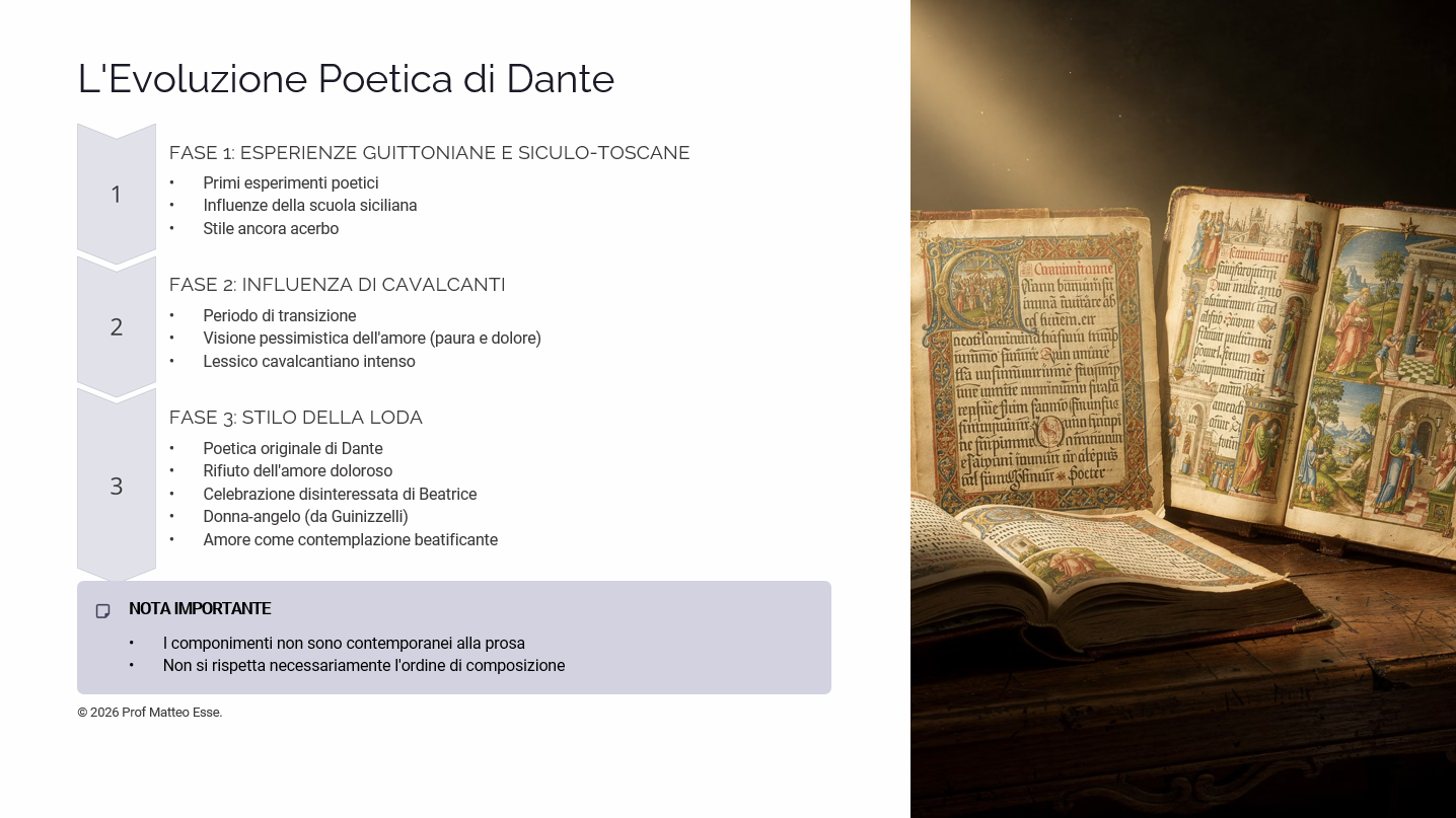 • Presentazione PowerPoint (11 slide): Struttura chiara e professionale. Focus su: prosimetro, la figura di Beatrice, lo stilo della loda, il confronto con Cavalcanti e Guinizzelli.