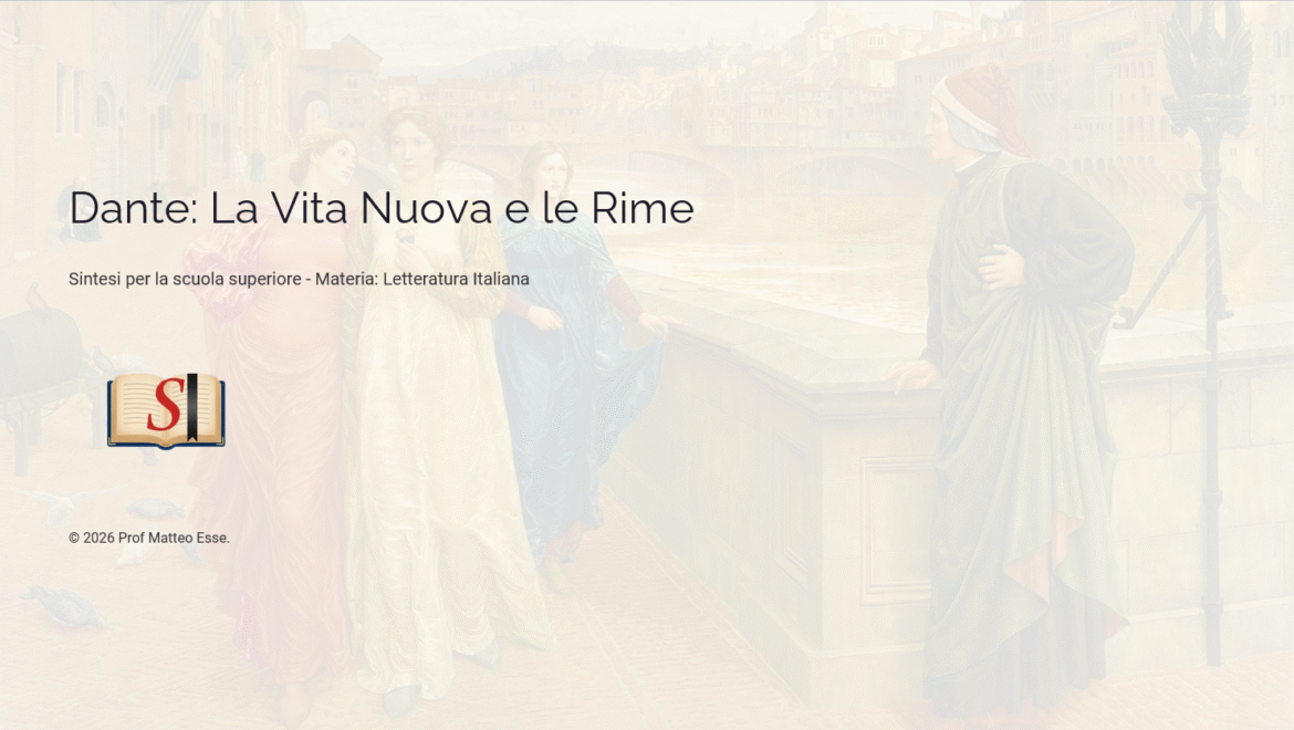 Questo kit didattico esplora il capolavoro giovanile di Dante, la Vita Nuova, e l’universo delle Rime. Il materiale guida la classe attraverso il passaggio dal classicismo cortese allo Stilnovo, fino alla sperimentazione delle rime “petrose”. Progettato per circa 60-90 minuti di attività.