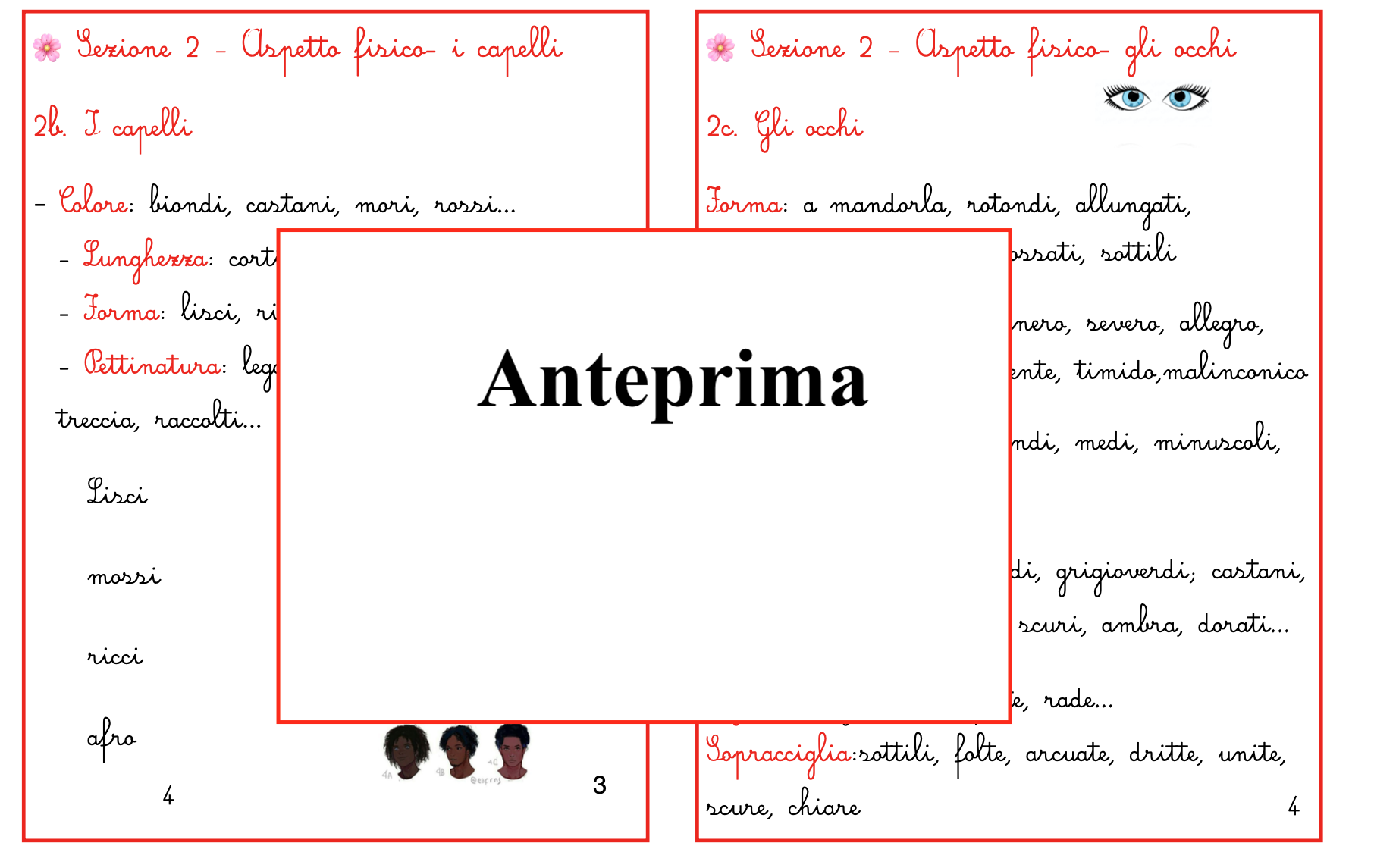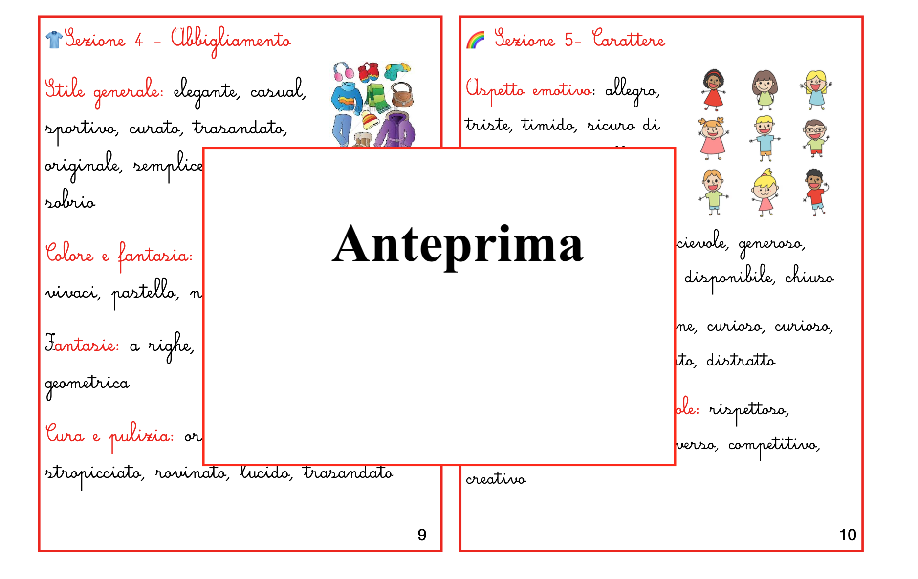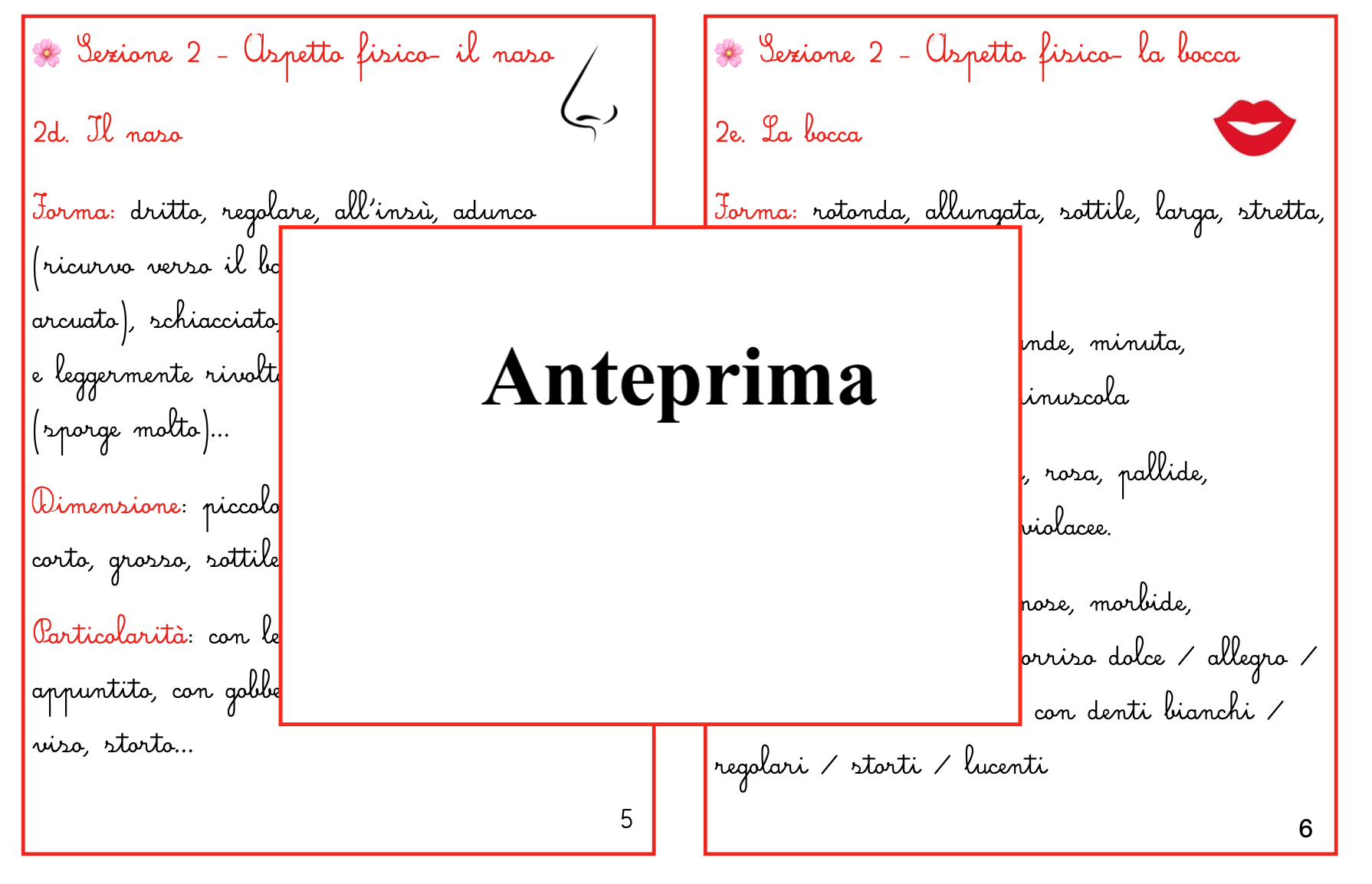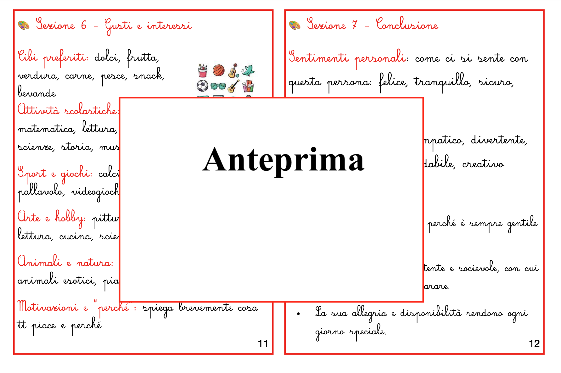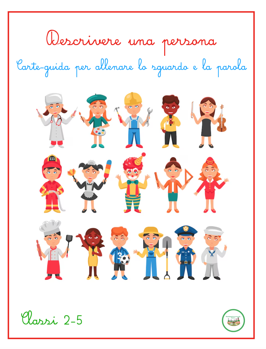 Osservare, riconoscere, descrivere: tre gesti che aiutano i bambini a conoscere il mondo — e se stessi. Questo materiale propone una serie di carte guida che accompagnano i bambini nella descrizione di una persona in modo chiaro, graduale e autonomo. Le carte conducono passo dopo passo: 👤 Chi è – come si chiama, chi voglio descrivere 😊 Aspetto fisico – viso, capelli, occhi, naso, bocca, orecchie 💪 Corporatura – altezza, forma del corpo, movimenti 👗 Abbigliamento – stile, colori, cura 💫 Carattere – atteggiamenti, comportamenti 🎨 Gusti e interessi – ciò che piace e che ci rende unici 🪞 Conclusione – come vedo o percepisco la persona descritta Ogni carta offre parole, esempi e spunti di osservazione che permettono al bambino di allenare lo sguardo e il linguaggio, fino a costruire in autonomia un testo descrittivo completo e coerente. È un materiale flessibile e intuitivo: può essere usato in autonomia, come proposta di libera scelta o lavoro individuale; oppure in laboratorio linguistico, per arricchire il lessico e la consapevolezza espressiva; o ancora come supporto per attività di arte e immagine, nella rappresentazione del volto o del corpo. 👉 Un modo semplice e naturale per insegnare ai bambini a guardare con attenzione, a scegliere le parole giuste e a descrivere con rispetto e precisione. 💡 Ideale per Scuola primaria (classi II–IV) Laboratori linguistici e attività di osservazione Percorsi Montessori e attività di libera scelta Materiale stampabile pronto all’uso in 12 pagine