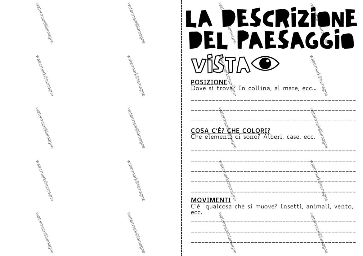 La scheda guida, passo passo, a usare i sensi per osservare il paesaggio con domande guida. È previsto anche uno spazio per disegnare il paesaggio.