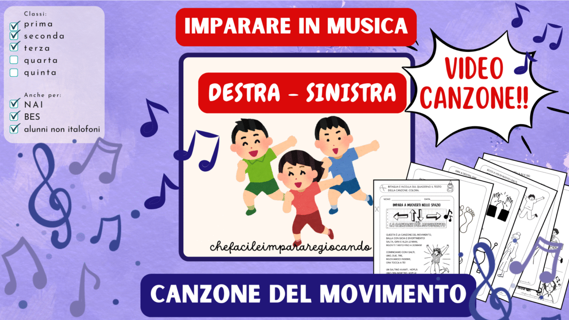 Questa canzone del movimento è uno strumento educativo coinvolgente e dinamico, pensato per aiutare i bambini a imparare i concetti di destra e sinistra attraverso il corpo, la musica e il gioco.