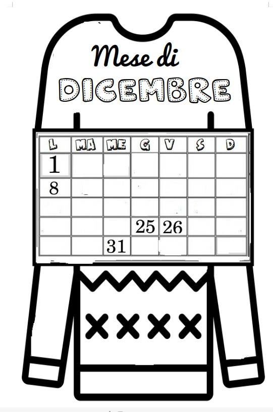 scheda interattiva sul mese di dicembre; calendario da completare in soggetto maglione