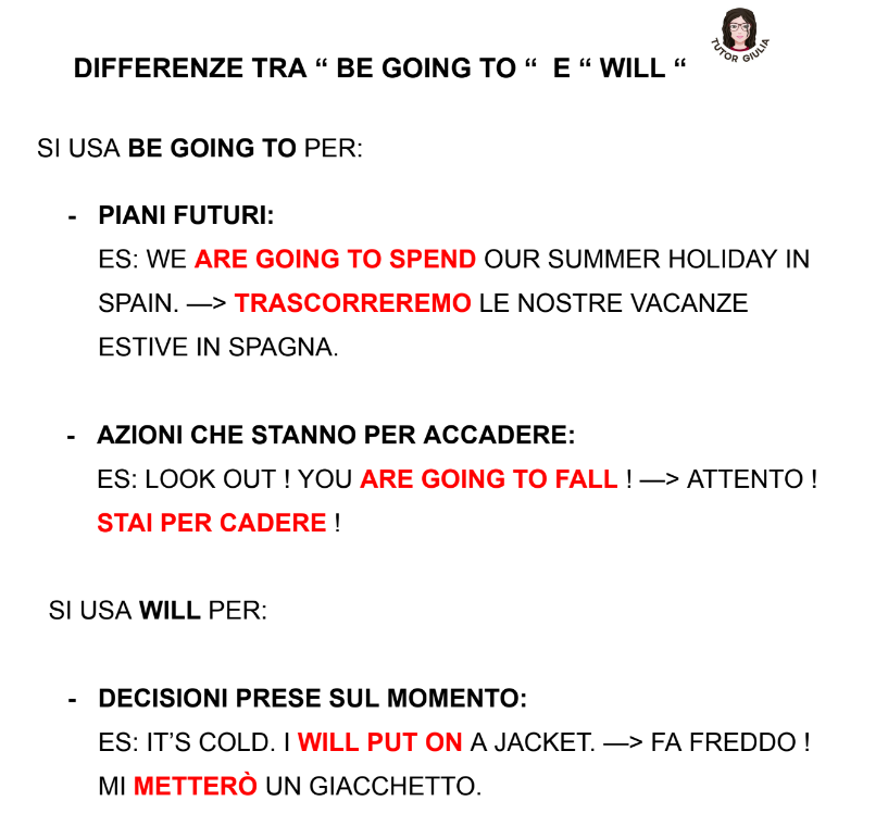 Schema, con esempi, dell’utilizzo e differenze di BE GOING TO e WILL.