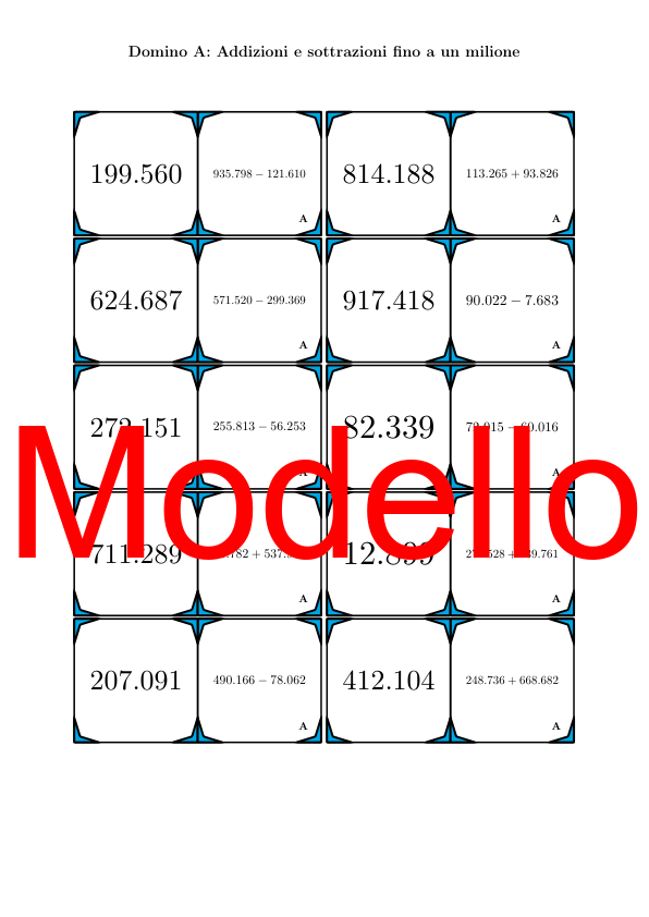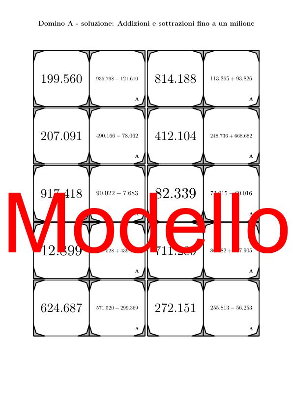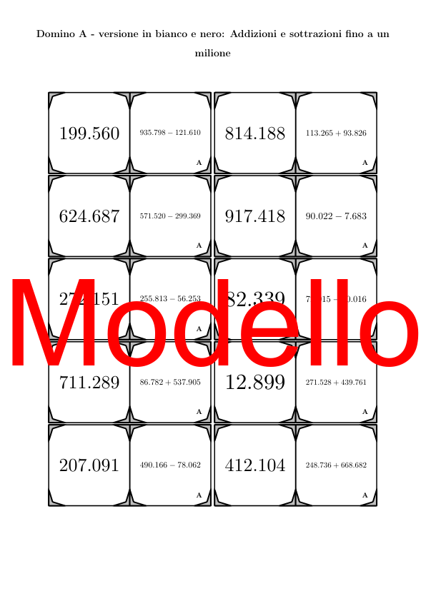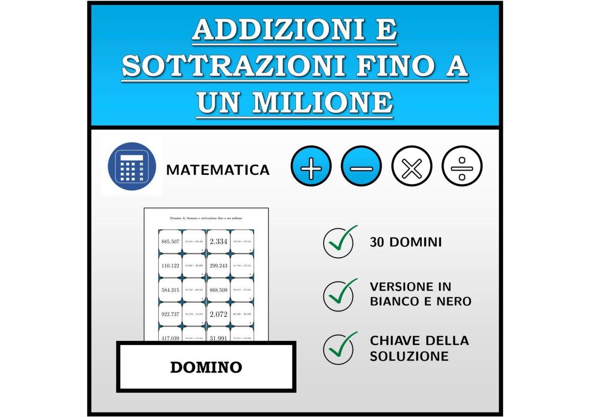 Il materiale contiene in totale 30 set di Domino (attività matematiche) sul tema addizioni e sottrazioni fino a un milione, così suddivisi: