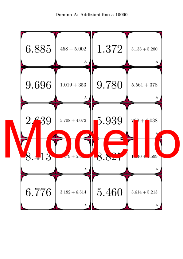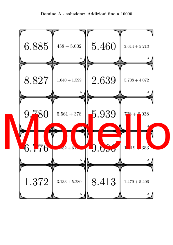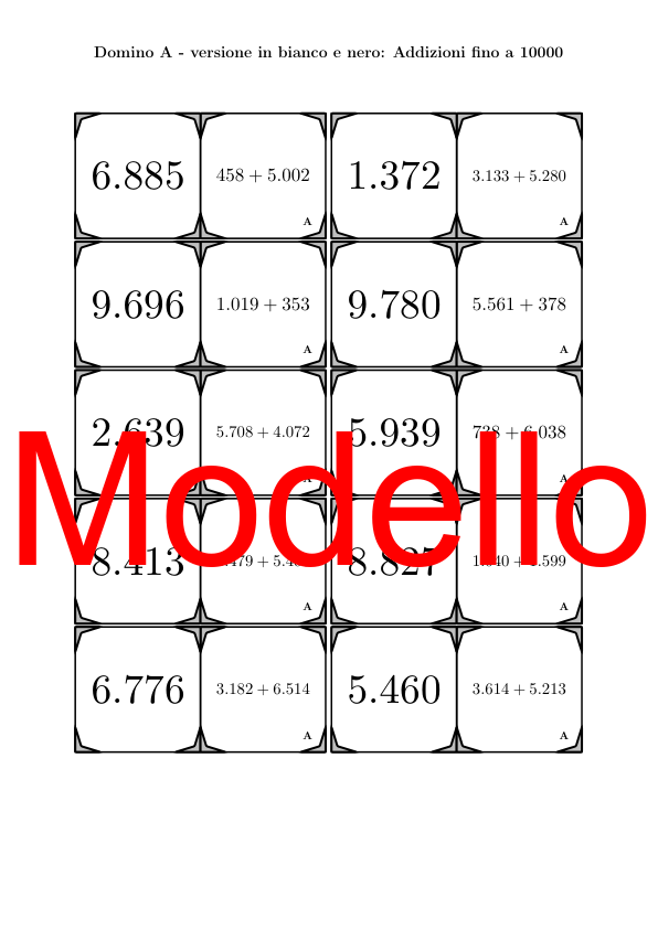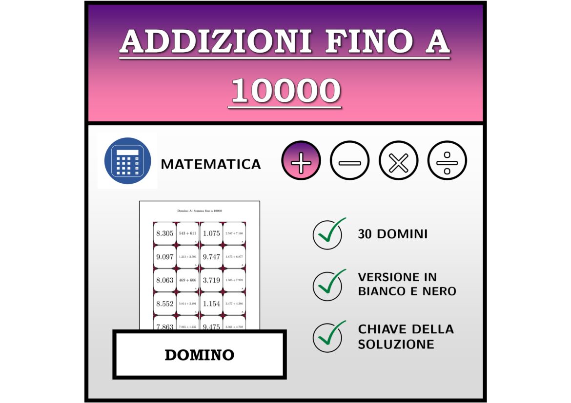 Il materiale contiene in totale 30 set di Domino (attività matematiche) sul tema addizioni fino a 10000, così suddivisi: