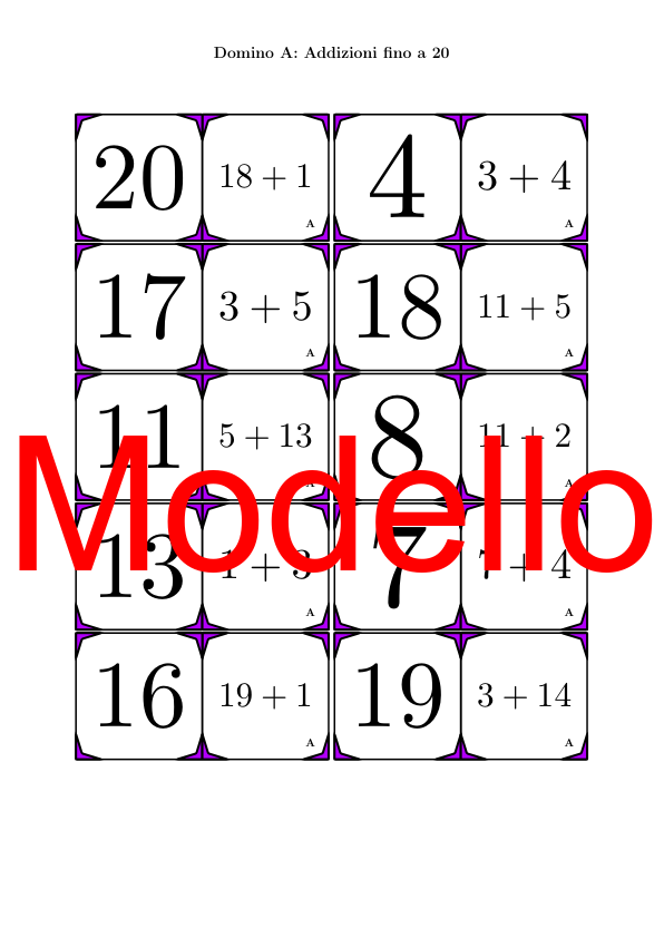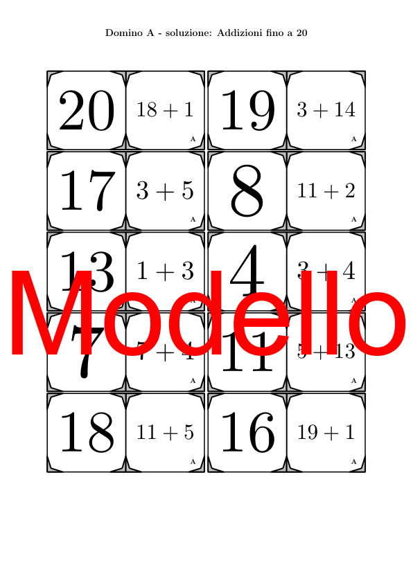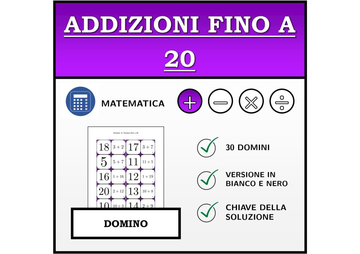 Il materiale contiene in totale 30 set di Domino (attività matematiche) sul tema addizioni fino a 20, così suddivisi: