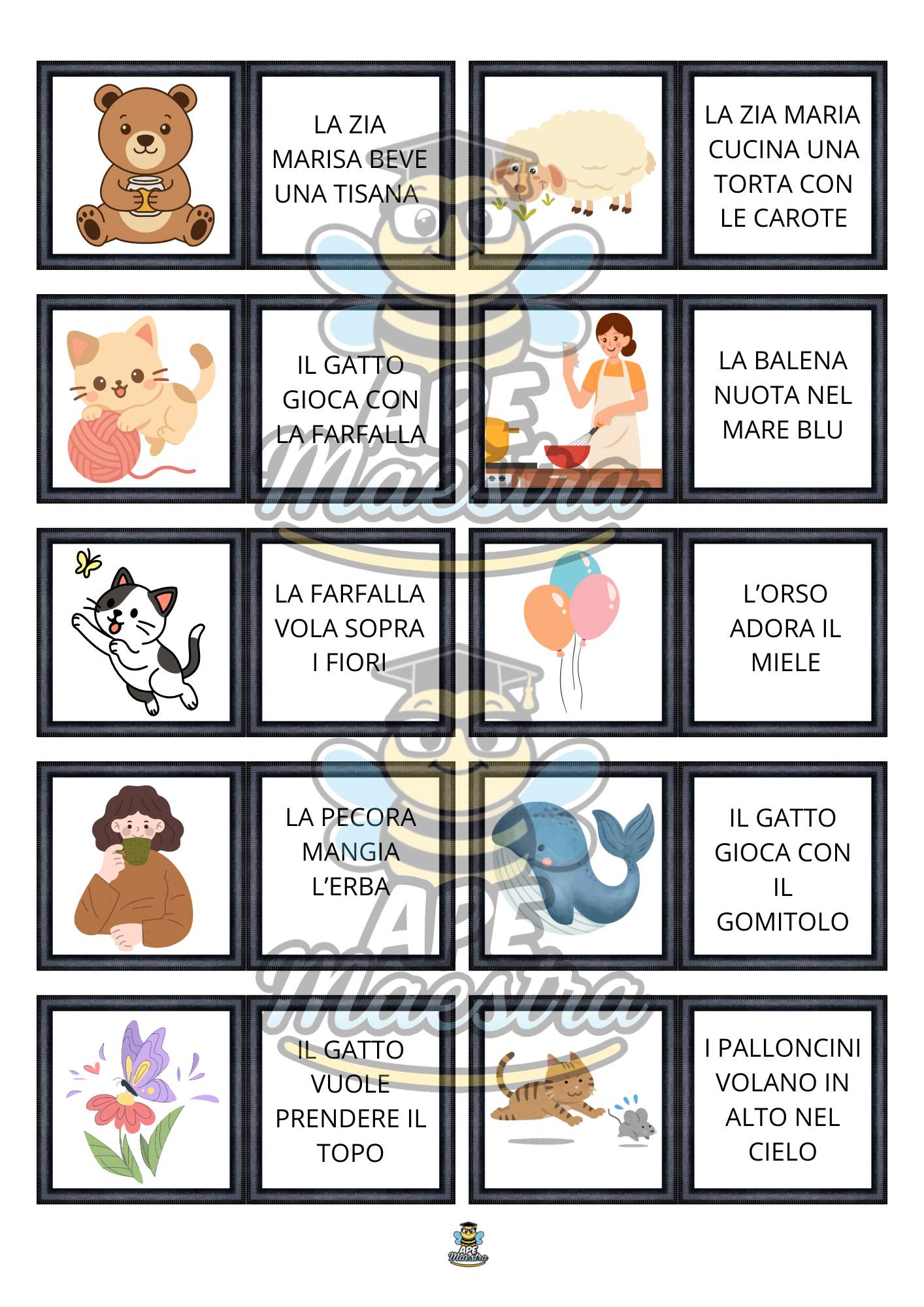 Gioco didattico pensato per alunni con difficoltà che necessitano di strumenti ludici per esercitare la lettura, ma utilizzabile in classe prima nei primi approcci alla lettura di frasi.
