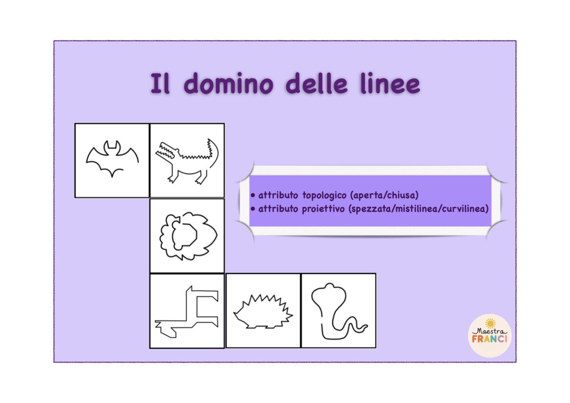 Nel gioco, l’attributo topologico (linee aperte e chiuse) entra in relazione con quello proiettivo (linee spezzate, mistilinee e curvilinee): ogni tessera invita gli alunni a confrontare più caratteristiche della stessa linea, favorendo una comprensione più profonda e non isolata dei concetti geometrici. In questo modo i bambini imparano a osservare, descrivere e classificare le linee mettendo in relazione diversi punti di vista.