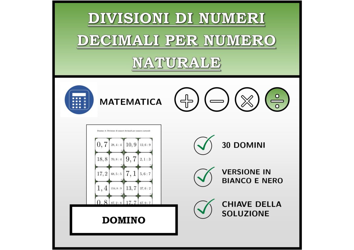 Il materiale contiene in totale 30 set di Domino (attività matematiche) sul tema divisioni di numeri decimali per numeri naturali, così suddivisi:
