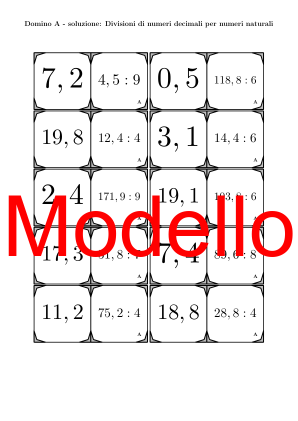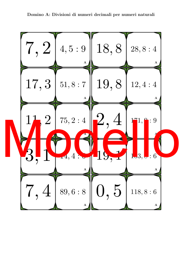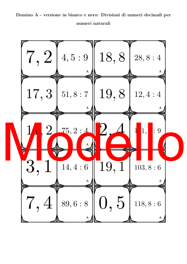 Il materiale contiene in totale 30 set di Domino (attività matematiche) sul tema divisioni di numeri decimali per numeri naturali, così suddivisi: