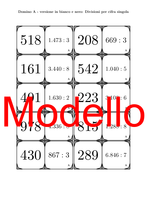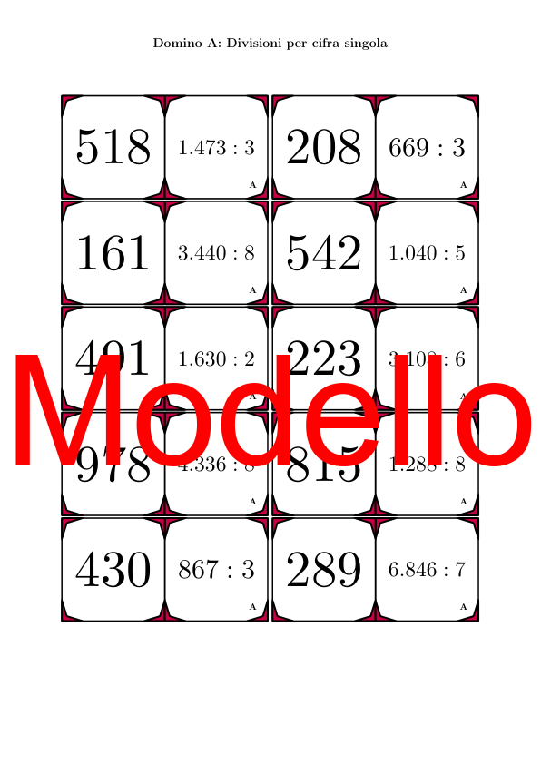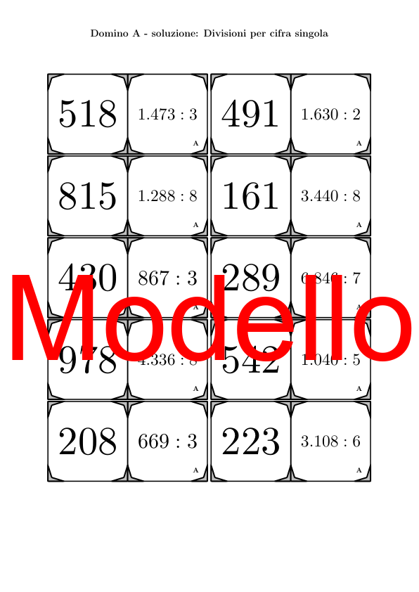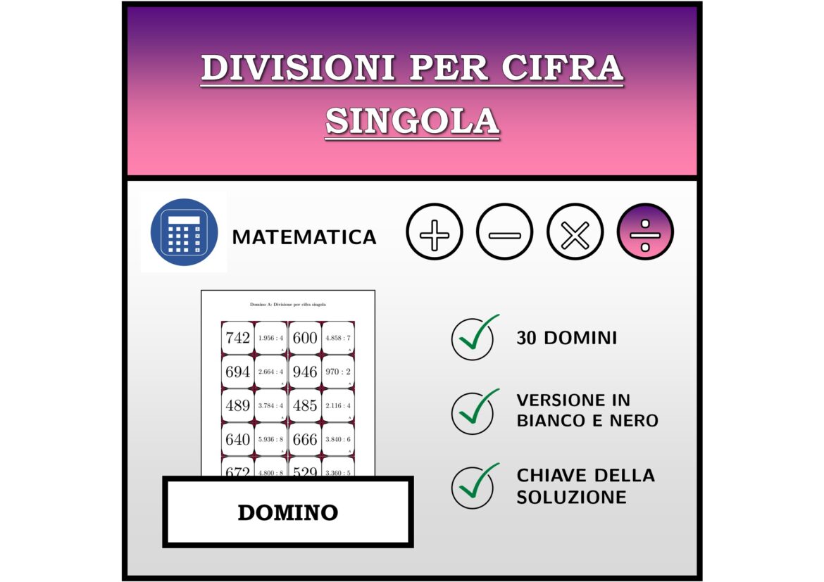 Il materiale contiene in totale 30 set di Domino (attività matematiche) sul tema divisioni per cifra singola, così suddivisi: