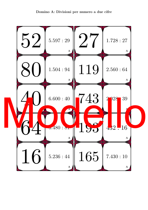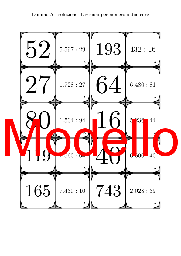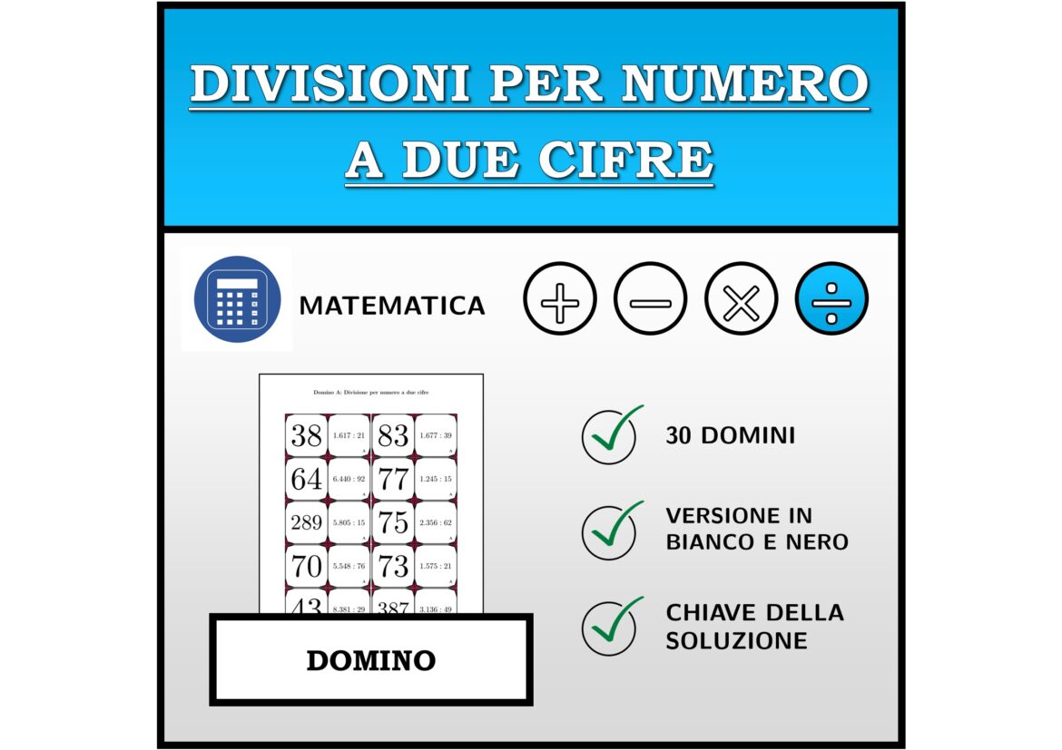 Il materiale contiene in totale 30 set di Domino (attività matematiche) sul tema divisioni per numero a due cifre, così suddivisi: