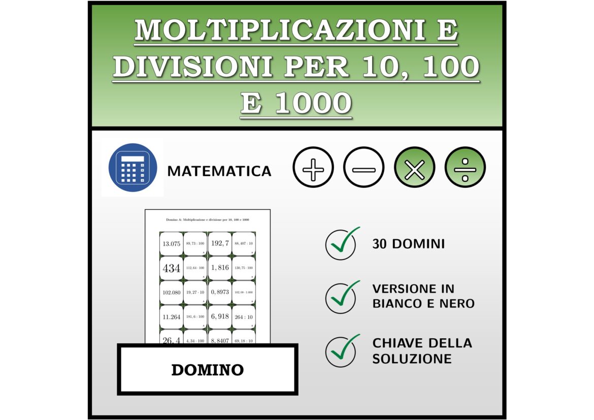 Il materiale contiene in totale 30 set di Domino (attività matematiche) sul tema moltiplicazioni e divisioni per 10, 100 e 1000, così suddivisi: