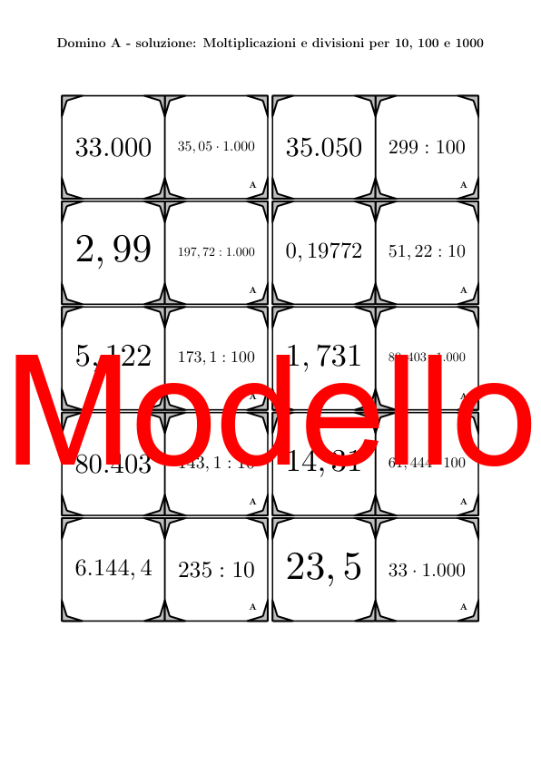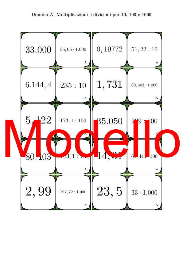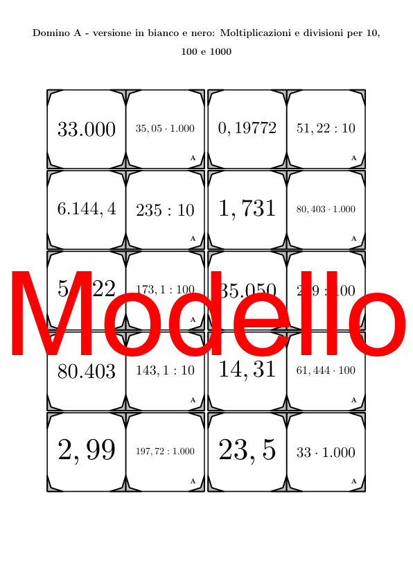 Il materiale contiene in totale 30 set di Domino (attività matematiche) sul tema moltiplicazioni e divisioni per 10, 100 e 1000, così suddivisi: