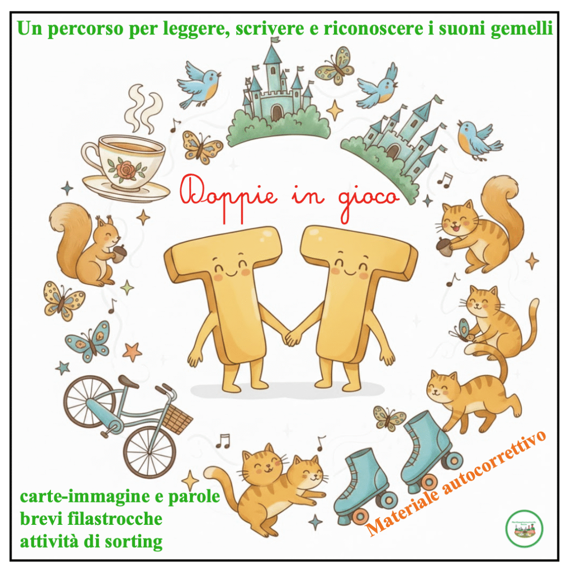 Un percorso Montessori per leggere, scrivere e riconoscere le lettere doppie in modo attivo e autonomo. Il materiale contiene carte immagine, filastrocche e attività di sorting con autocorrezione, pensate per la classe seconda. Cosa troverai nel materiale: 1️⃣ Carte immagine con scrittura autonoma 15 immagini di parole con doppie. Frase guida: “Questo/a è un/una …” I bambini osservano, scrivono la parola mancante e si autocorreggono con i cartellini di verifica. 2️⃣ Filastrocche con le doppie 6 brevi filastrocche da leggere, copiare e osservare. Stimolano il riconoscimento dei suoni raddoppiati e la scrittura consapevole. 3️⃣ Attività di Sorting: “Con doppie / Senza doppie” 21 parole con doppie e 21 senza. Due contenitori o tappetini: “Con doppie” e “Senza doppie”. I bambini prendono i cartellini immagine, autodettano la parola, fanno attenzione al suono raddoppiato e inseriscono il cartellino nel contenitore corretto. A fine attività, confrontano il loro ordinamento con la tavola di controllo per autocorrezione. Obiettivi pedagogici: Riconoscere e distinguere i suoni raddoppiati. Favorire l’ascolto attento e la pronuncia corretta. Stimolare l’autonomia nella scrittura e la capacità di autocorrezione. Sviluppare attenzione, concentrazione e amore per le parole. materiale stampabile pronto all’uso; 11 pagine