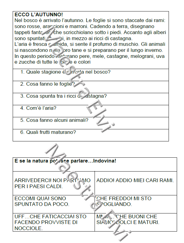 Nella proposta: lettura e comprensione, filastrocca delle foglie matte, ripasso del suono GLI (cruciverba), esercizio GLI o LI, rebus, crucipuzzle, riordino di parole per formulare frasi di senso compiuto. L’attività ” E se la natura potesse parlare…” è stata proposta come una serie di indovinelli e utilizzata, solo oralmente, anche per introdurre la differenza tra discorso diretto e indiretto senza fare uso, ovviamente, della terminologia specifica. È stato un esperimento: parlano le rondini… adesso racconta tu quello che hanno detto…e così via.