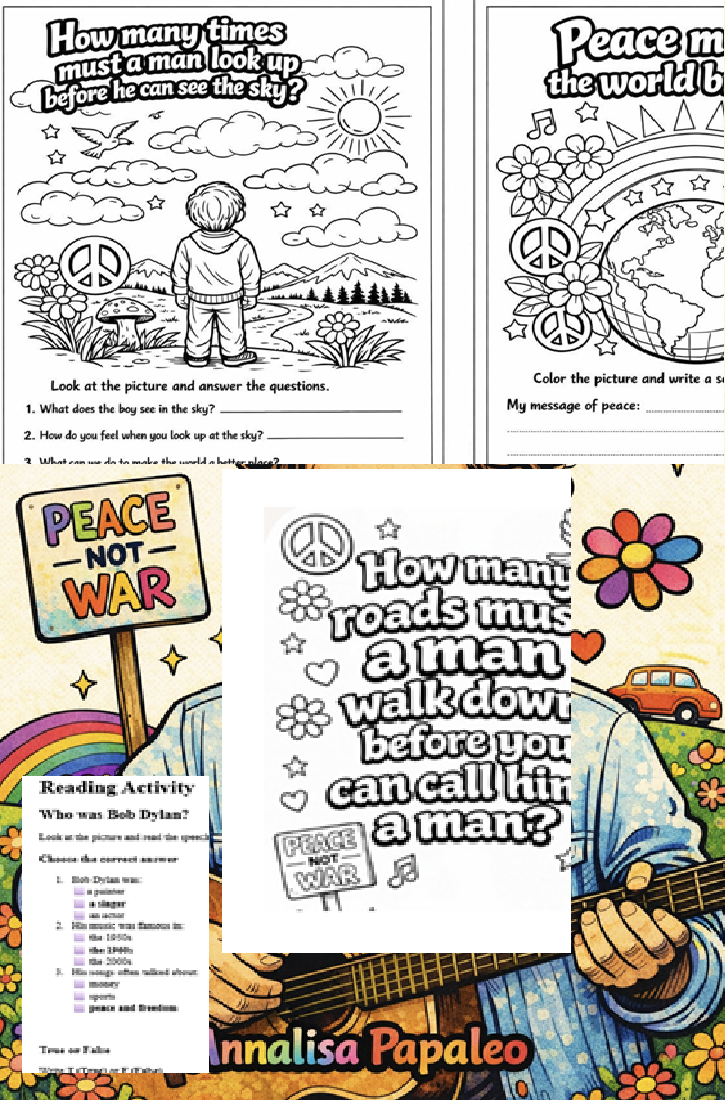 Il materiale accompagna gli studenti alla scoperta di Dylan attraverso attività molto semplici e visive. Si parte da un’illustrazione in cui il cantautore “si presenta” attraverso brevi fumetti in inglese: frasi essenziali che raccontano chi era e quali messaggi portava la sua musica. L’immagine è pensata anche come attività artistica, perché può essere colorata e utilizzata come pagina introduttiva del lavoro.