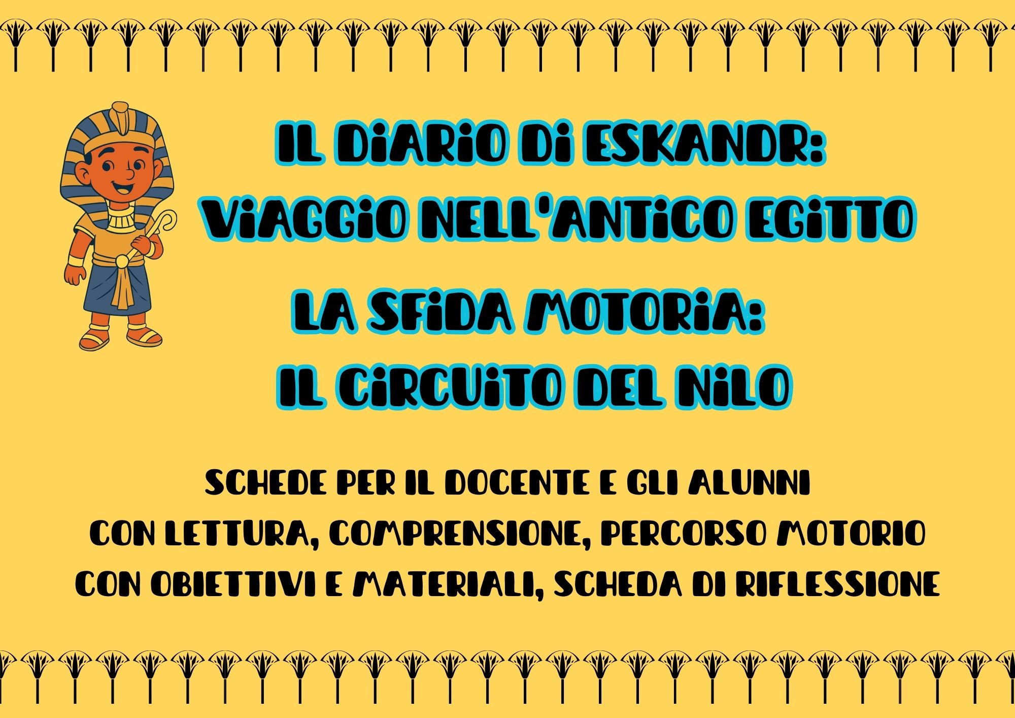 Attività pensata per unire la storia all’attività motoria in occasione delle giornate dello sport. Il file contiene un testo di diario, che racconta in sintesi la società egizia, una comprensione, un percorso organizzato con obiettivi e materiali da svolgere in palestra, una scheda di riflessione legata all’attività motoria e un glossario con i termini più significativi e un’attività da far svolgere ai bambini sulla ricerca di parole.