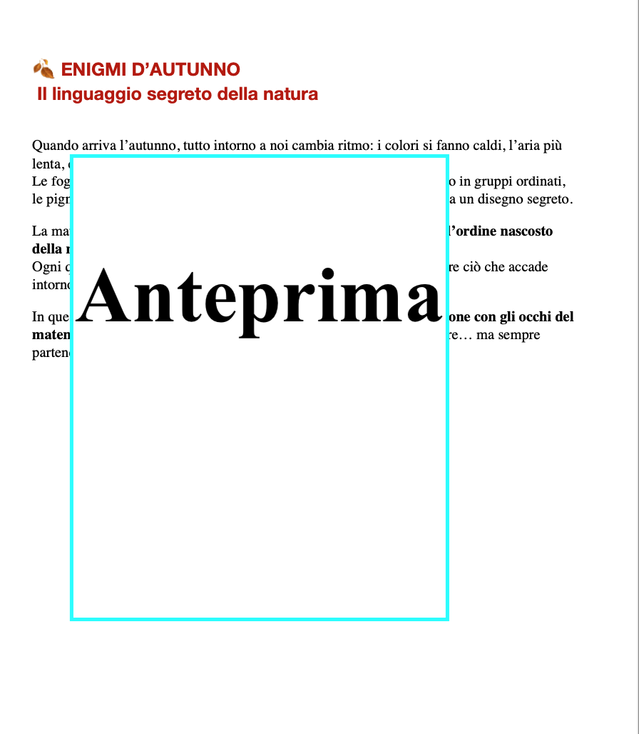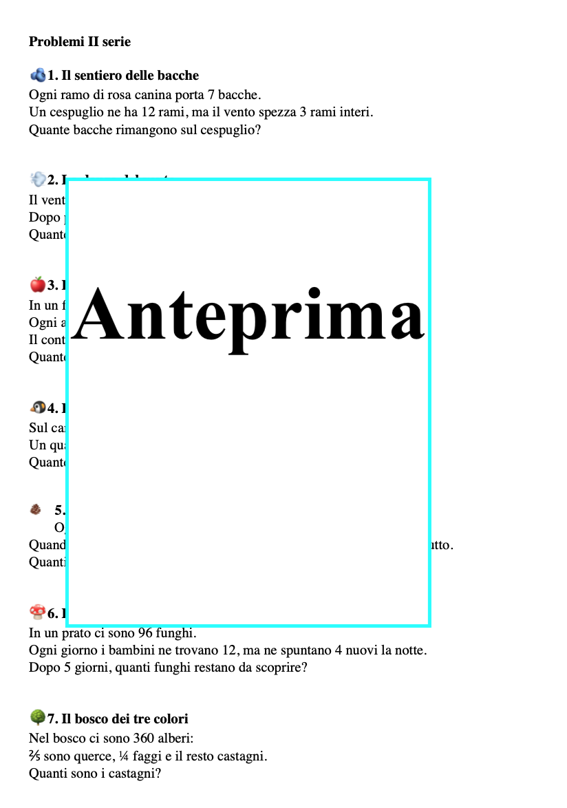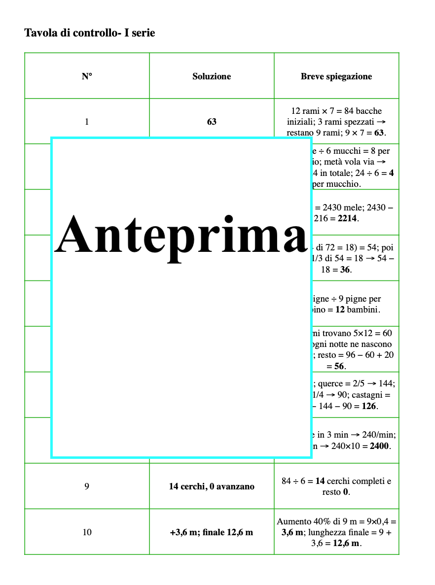 Una raccolta di problemi per esplorare l’autunno attraverso la matematica, sviluppando capacità di calcolo, ragionamento logico, stima e osservazione. I problemi sono ispirati agli elementi naturali della stagione (foglie, frutti, pioggia, animali) e combinano situazioni concrete con esercizi di calcolo. Struttura del materiale: Serie – Livello avanzato: problemi più complessi, con operazioni multiple, frazioni, percentuali e ragionamento combinatorio.Serie – Livello intermedio: problemi più semplici, con operazioni di base, divisioni, moltiplicazioni e logica elementare.Tavola di controllo: guida alle risposte per facilitare la correzione autonoma o guidata. Può essere utilizzata anche come strumento di autovalutazione.