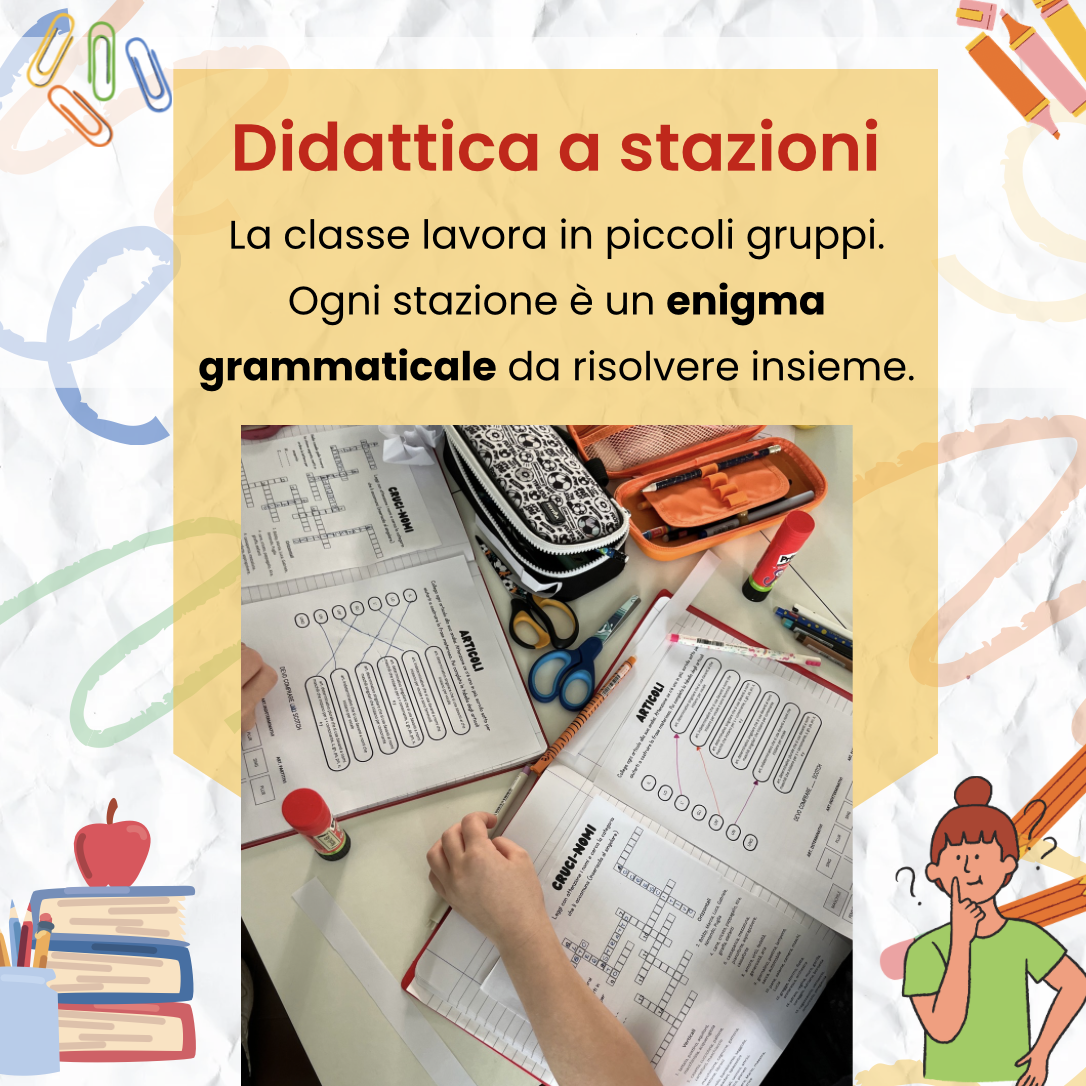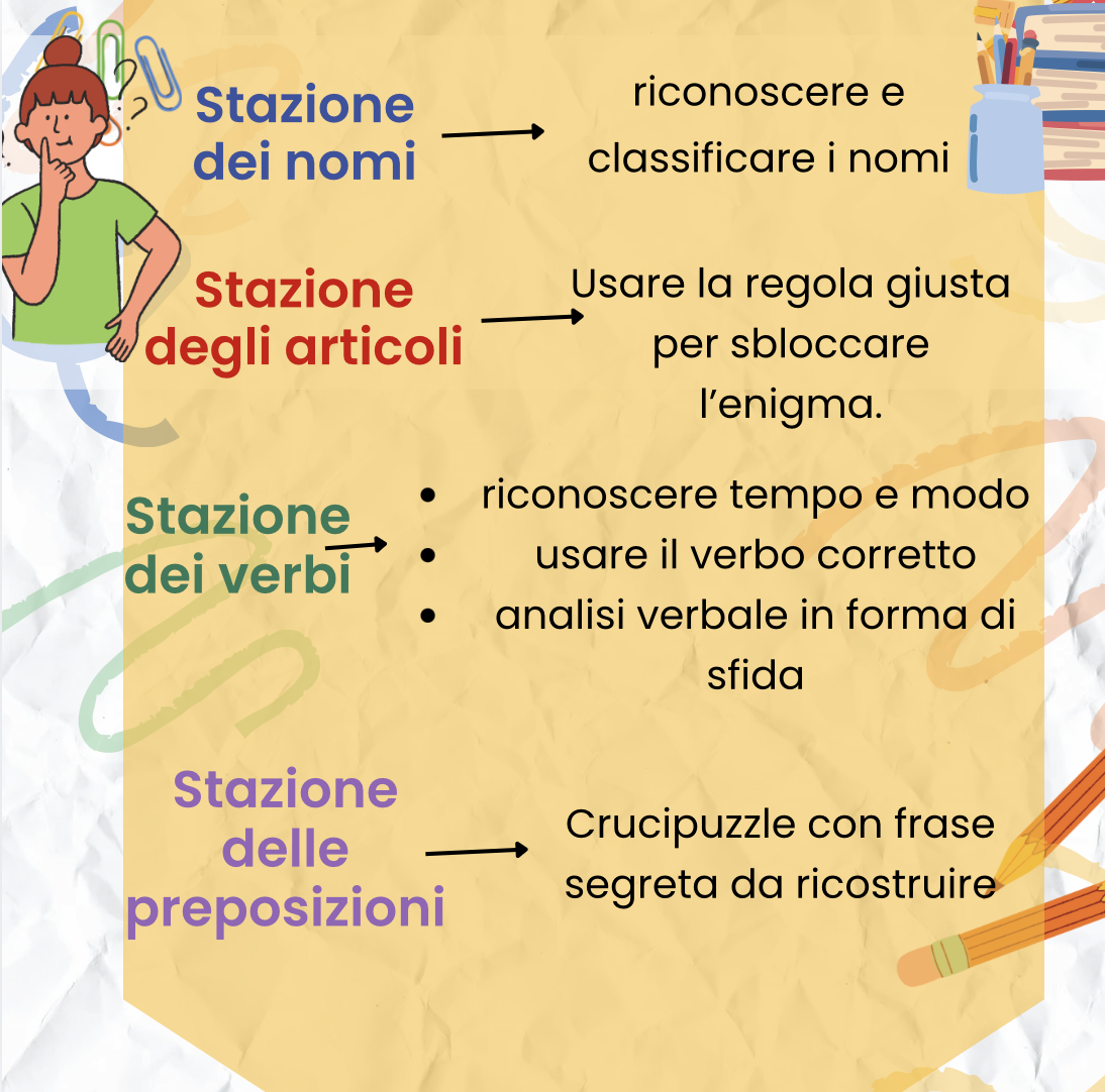 Un percorso di didattica a stazioni per consolidare le principali categorie grammaticali in modo attivo, cooperativo e coinvolgente.