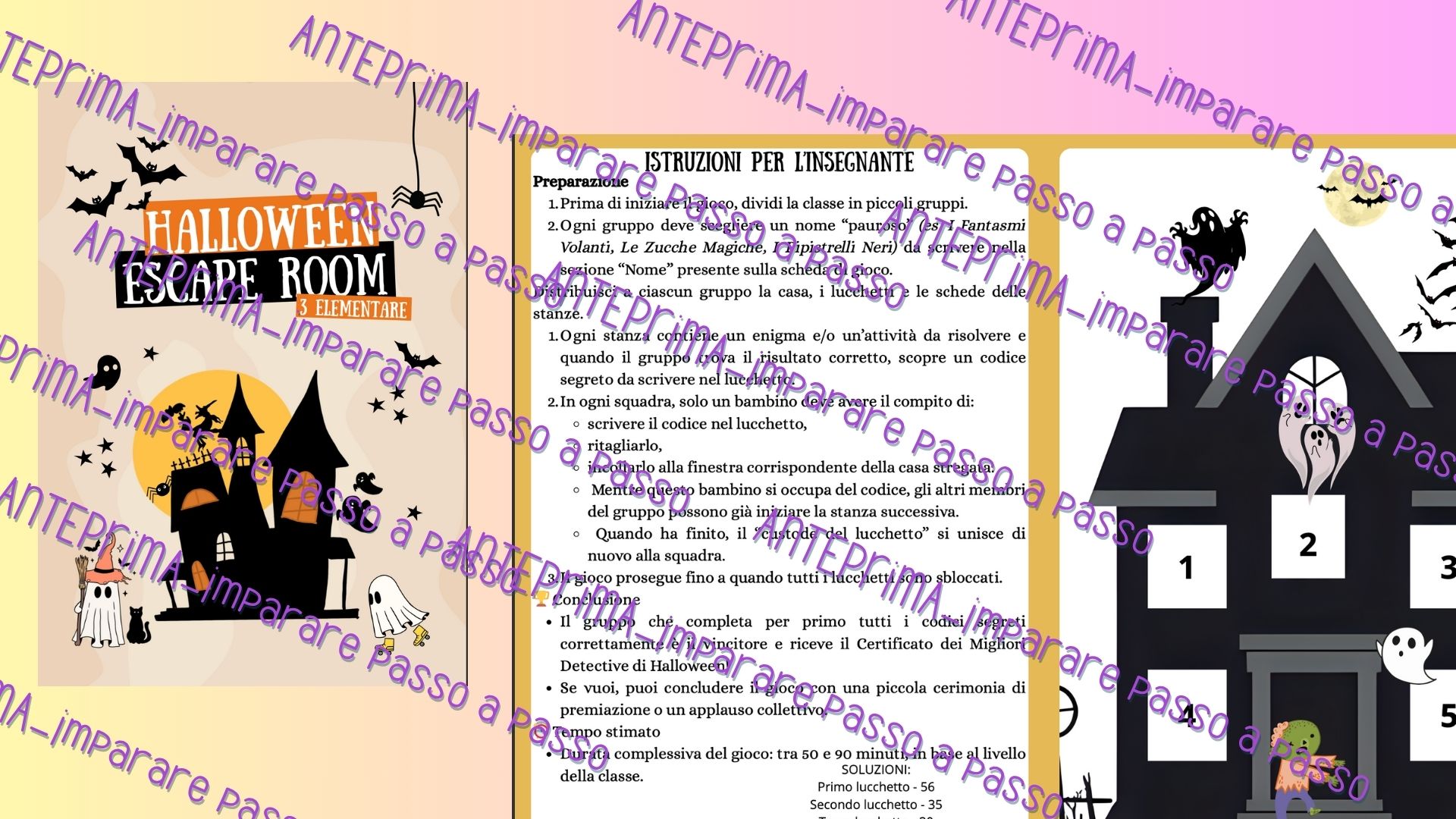 🎃 ESCAPE ROOM DI HALLOWEEN – MATEMATICA 👻 🕸️ Un’avventura da brivido per imparare divertendosi! Questo PDF di 10 pagine trasforma la matematica in un gioco di squadra a tema Halloween. I bambini dovranno risolvere enigmi, indovinelli e operazioni per sbloccare i lucchetti della Casa Stregata e conquistare il titolo di Migliori Detective di Halloween! 🏆 ✨ Cosa include: 📄 5 schede con “stanze” misteriose piene di addizioni, sottrazioni, moltiplicazioni e problemi a tema Halloween 🔐 Lucchetti da ritagliare e incollare 🧙♀️ Enigmi e indovinelli in rima 🧛♂️ Istruzioni dettagliate per l’insegnante e soluzioni incluse 🎓 Certificato finale per la squadra vincitrice 🕰️ Tempo di utilizzo: 👉 Da 50 a 90 minuti, perfetto per una lezione speciale o un’attività di classe durante la settimana di Halloween. 🧩 Come funziona: L’insegnante divide la classe in gruppi, ognuno sceglie un nome “pauroso” (es. Le Zucche Magiche, I Pipistrelli Neri 🦇) e parte alla ricerca dei codici segreti. Solo chi risolve tutti gli enigmi potrà “scappare” dalla casa stregata! 💡 Ideale per: Maestrə che vogliono proporre un’attività coinvolgente, cooperativa e a tema stagionale per ripassare la matematica in modo ludico. 🧾 Formato: PDF stampabile – pronto all’uso! Car* insegnante, questi file sono destinati esclusivamente all’uso personale e per il lavoro con le tue classi o i tuoi bambini. Qualsiasi condivisione o distribuzione a colleghi o altri soggetti causa una violazione del diritto dell’autore. Se ti è piaciuto, segui la mia pagina “Imparare passo a passo” per altre risorse a tema e molto altro!!! Grazie 🧡
