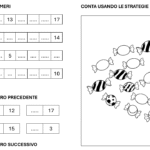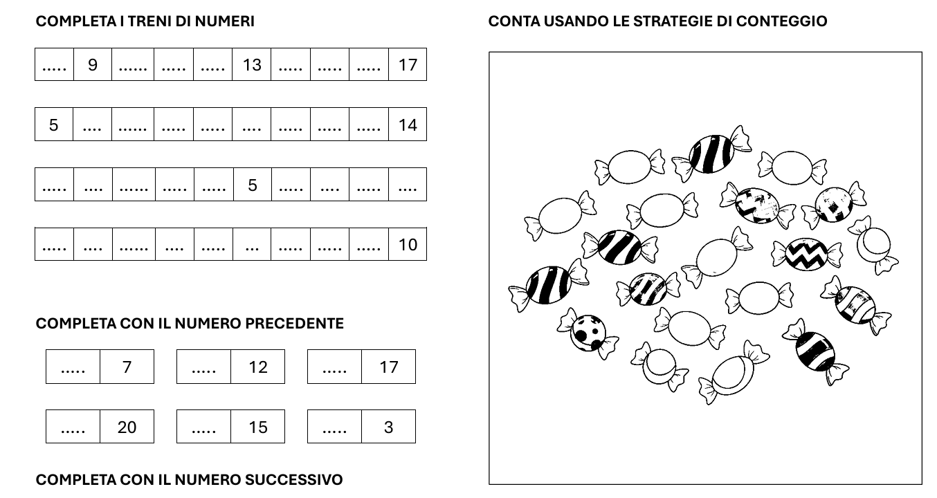 10 pagine di completamenti di linee di numeri, catene, operazioni, uguaglianze, conteggi e problemi che introducono alla differenza.